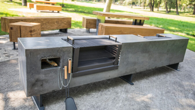 Autorem návrhu, který šikovně spojuje betonový gril, betonové podesty s