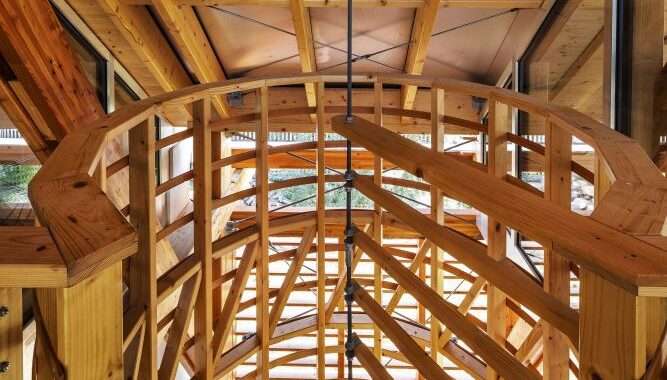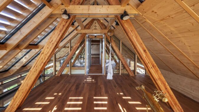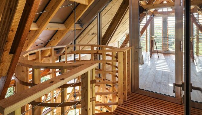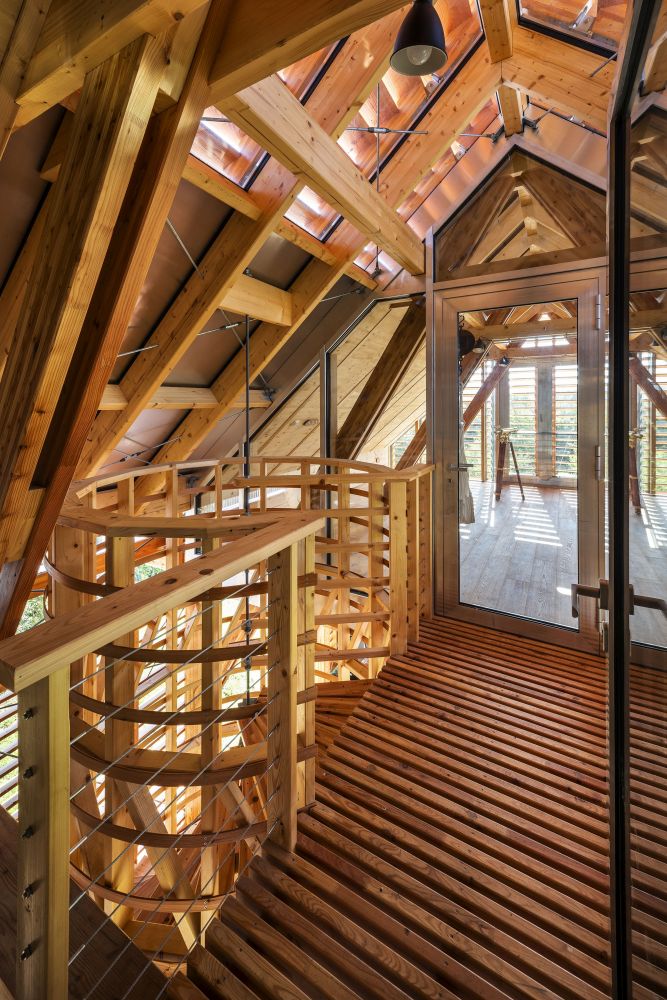 V přízemí je složené dřevo. Po točitých schodech vystoupáte do patra na lávku. Ta spojuje půdu staré budovy s podkrovím nové. V každé z nich je jediná místnost. Ve staré půdě hvězdárna a v nové přístavbě pozorovatelna. V pozorovatelně mezi prkny vnějšího stínění vidíte ven do okolní krajiny. Ve hvězdárně je šero a soukromí a světlo sem padá jen úzkým oknem. Část střechy se dá ale v noci odsunout a člověk může nerušeně pozorovat hvězdy.