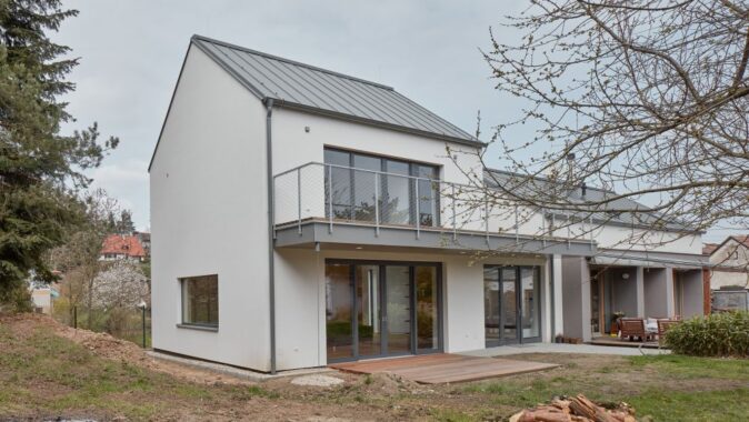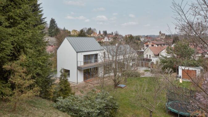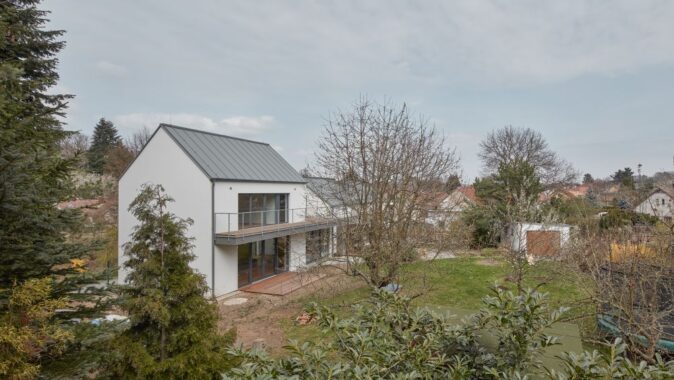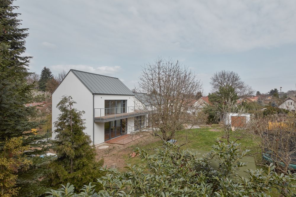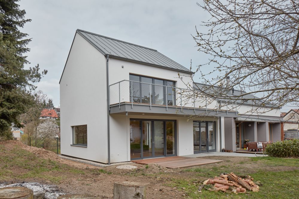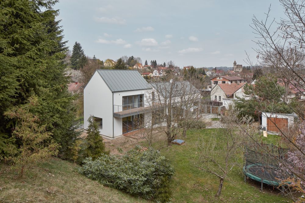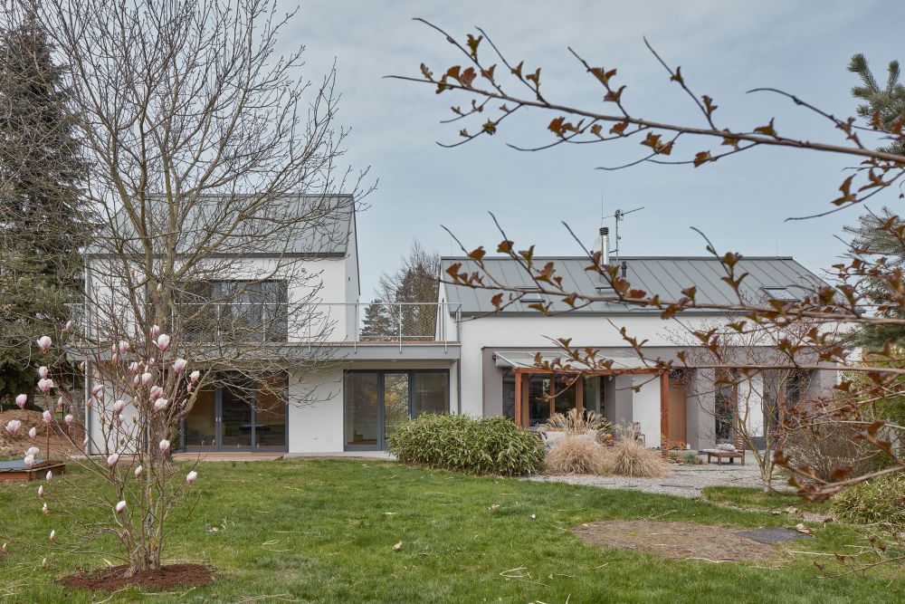Dům se sedlovou střechou se otevírá k jižní straně, směrem do zahrady. Tam směřuje i dominantní terasa, uvozující podestu, která obě stavby propojuje. Nový prosklený vstup je situován ze zahrady, krček mezi oběma domy vytvořil v přízemí vstupní halu. V patře je na krčku umístěna terasa umožňující dostatečné osvětlení přirozeným světlem pro dětské pokoje, umístěné v původním domě. Terasa je i společným sdíleným prostorem mezi ložnicí rodičů a dětí.