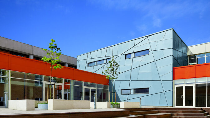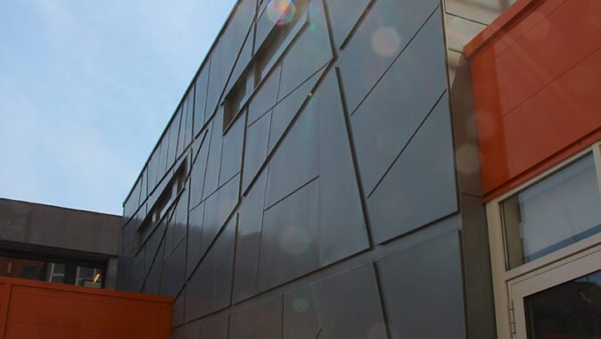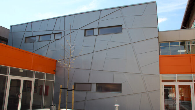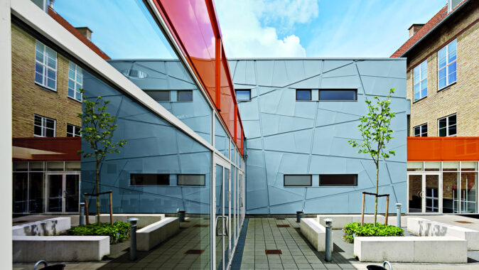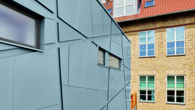 Dlouho důvěrně známý pohled studentů a učitelů gymnázia Sct. Knuds v ​​Odense: Vpravo hlavní budova z padesátých let 20. století, vlevo architektonicky naprosto odlišná přístavba ze sedmdesátých let 20. století. Mezi nimi stará spojovací budova s hlavním vstupem a sociálním zázemím, kterou čekala rekonstrukce. Tak jednoduše to ale architekti neviděli. Poznali šanci na komplexní zhodnocení zastaralého a nesourodého celku. „Navrhli jsme vedení školy vytvořit zcela novou budovu z odlišného materiálu, která by hlavní budovu a přístavbu zároveň oddělovala i spojovala“, říká architekt Mogens Milling z C & W Arkitekter.