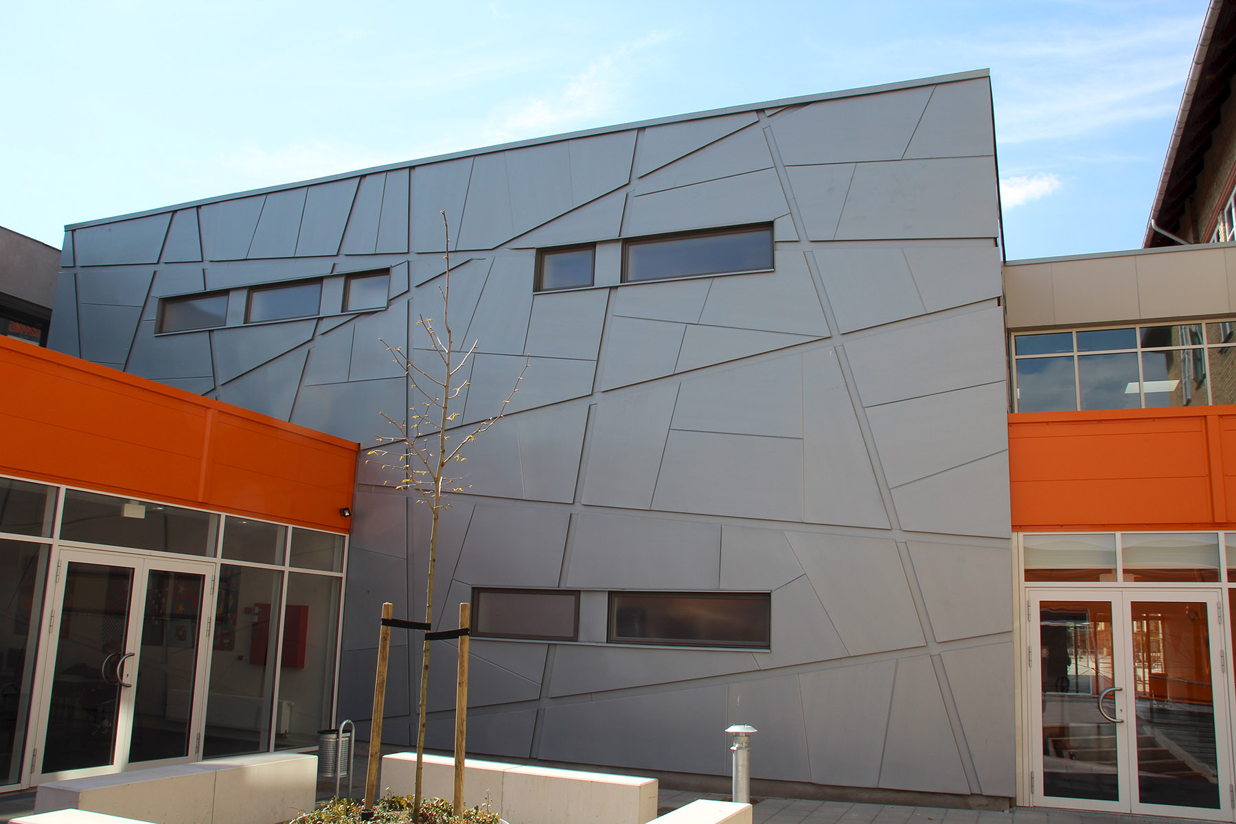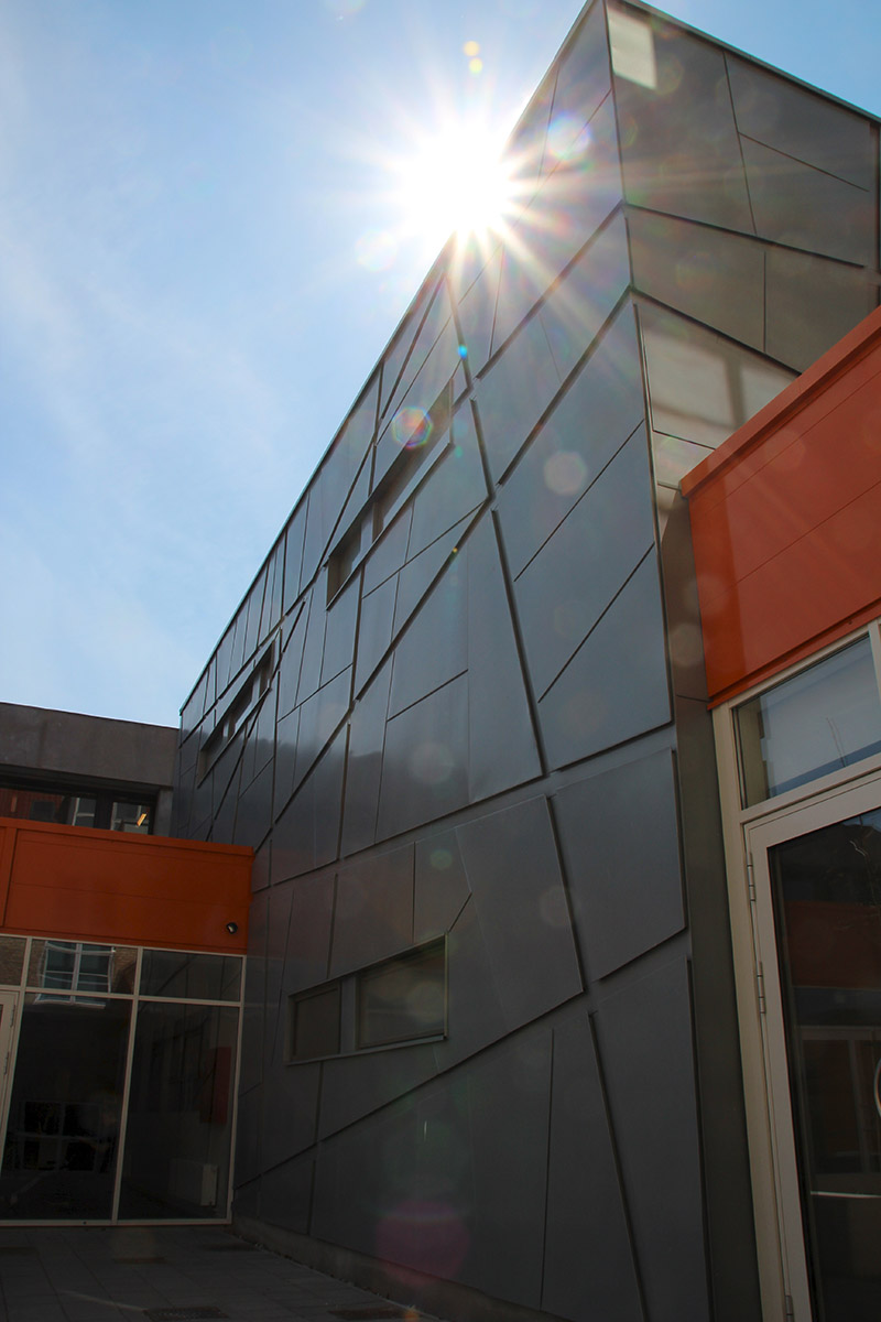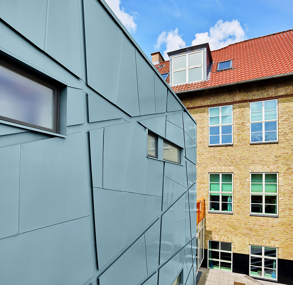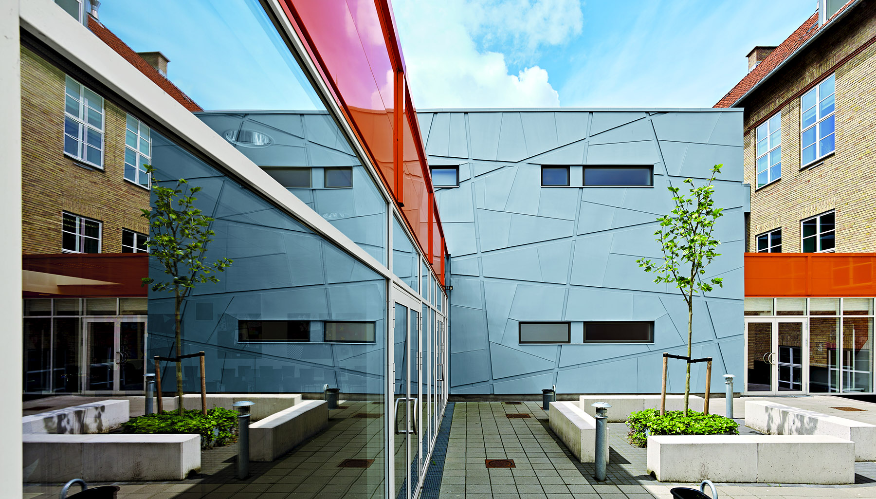 Dlouho důvěrně známý pohled studentů a učitelů gymnázia Sct. Knuds v ​​Odense: Vpravo hlavní budova z padesátých let 20. století, vlevo architektonicky naprosto odlišná přístavba ze sedmdesátých let 20. století. Mezi nimi stará spojovací budova s hlavním vstupem a sociálním zázemím, kterou čekala rekonstrukce. Tak jednoduše to ale architekti neviděli. Poznali šanci na komplexní zhodnocení zastaralého a nesourodého celku. „Navrhli jsme vedení školy vytvořit zcela novou budovu z odlišného materiálu, která by hlavní budovu a přístavbu zároveň oddělovala i spojovala“, říká architekt Mogens Milling z C & W Arkitekter.