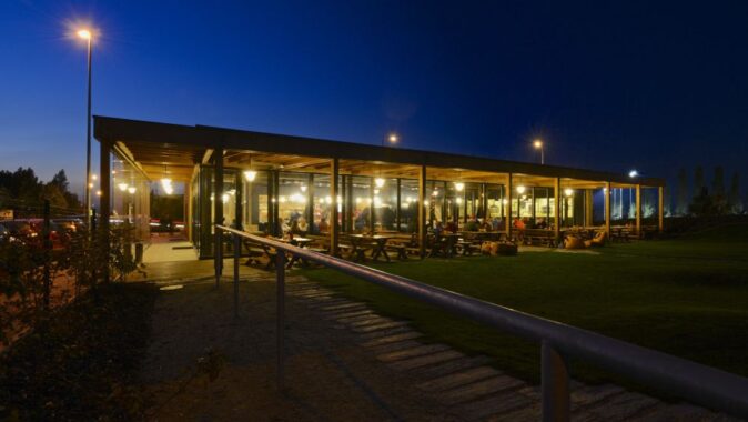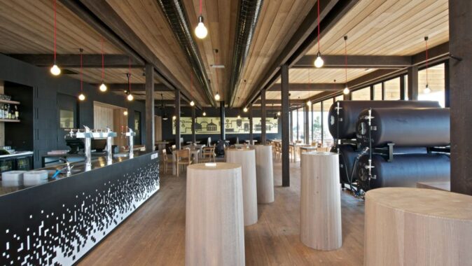 S rozšiřující se hmotou se dostáváme z prostorů výroby piva, přes zázemí restaurace, kde je kuchyně a přidružené provozy, do prostoru distribuce piva-restaurační části. Ta se od zbylých provozů (zděná část) liší dřevěnou nosnou konstrukcí propsanou do celého interiéru, obehnaného ze dvou stran prosklenou fasádou. Ta otvírá prostor restaurace do ulice Lochotínská a do zahrady v jihovýchodní části pozemku, kde je možnost fasádu zcela otevřít a propojit s terasou a zahradou. Vstup do restaurace a ostatních provozů je z ulice.