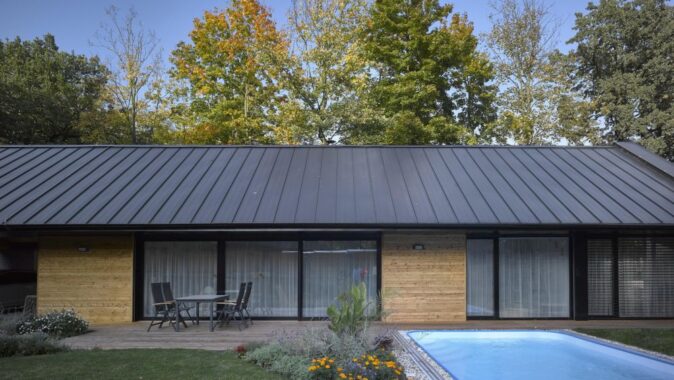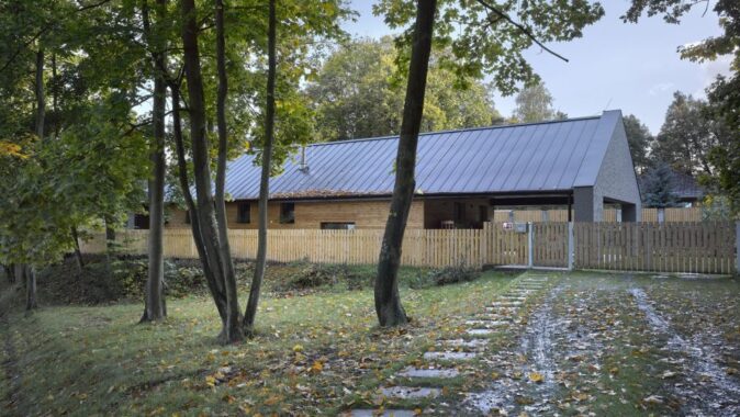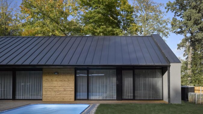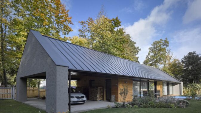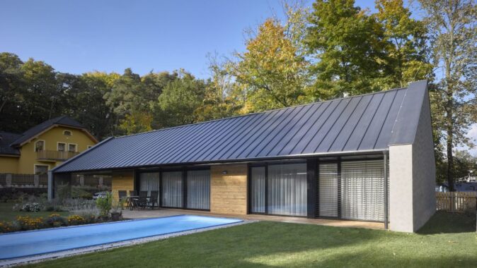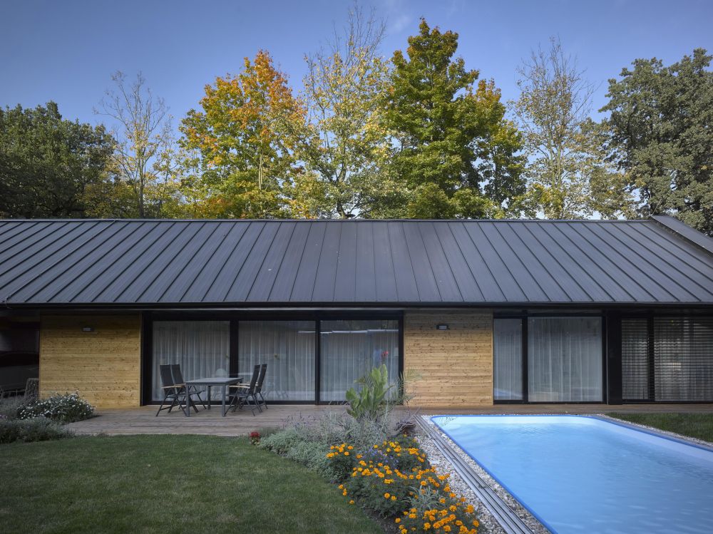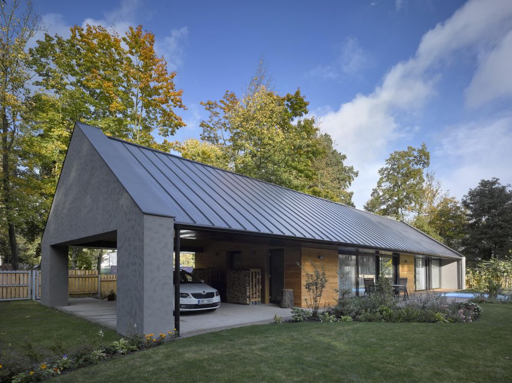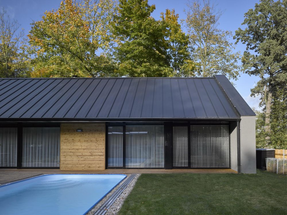 Místní regulace povolovala pouze šikmou střechu včetně mírného sklonu kolem 30 stupňů. To nakonec určilo základní proporce domu včetně jeho konstrukce. Na jednoduché zděné stavbě jsou uloženy sbíjené vazníky. Tvar střechy se propsal i do interiéru, kde stropy místností kopírují sklon vazníků. To celému interiéru, společně s otevřením na zahradu, dodává nezaměnitelný charakter. K dominantnímu modřínu na fasádě byly zvoleny kontrastní antracitové okenní rámy hliníkových oken a antracitová plechová střecha. Vše jsme navrhovali tak, aby dům splynul s okolními vzrostlými stromy.