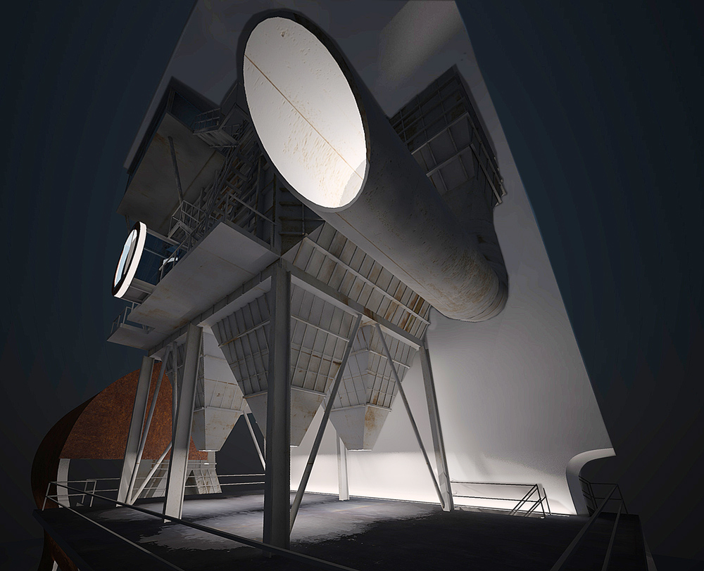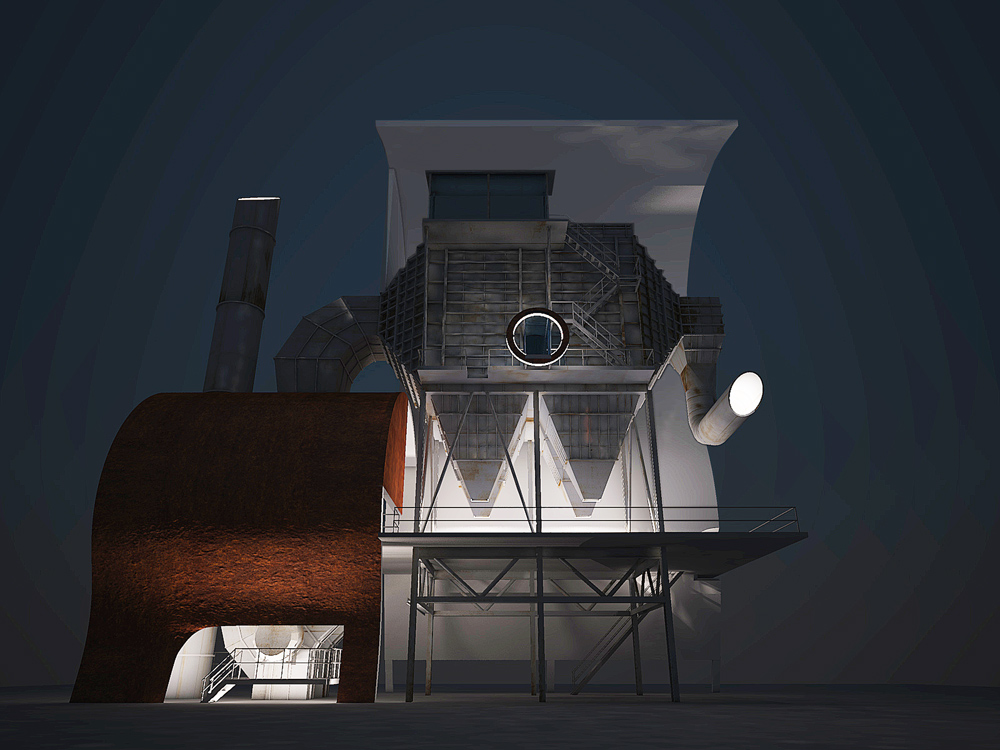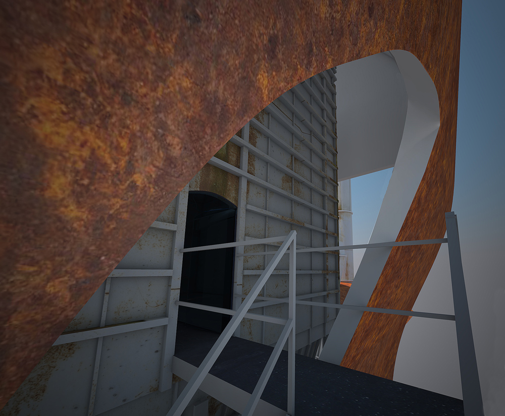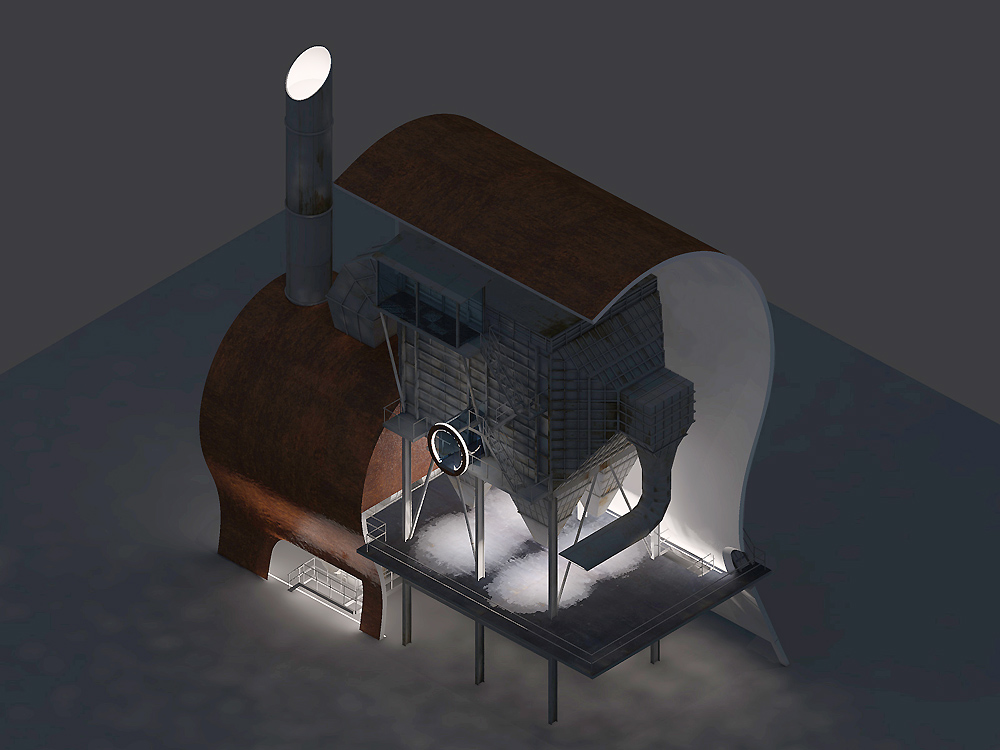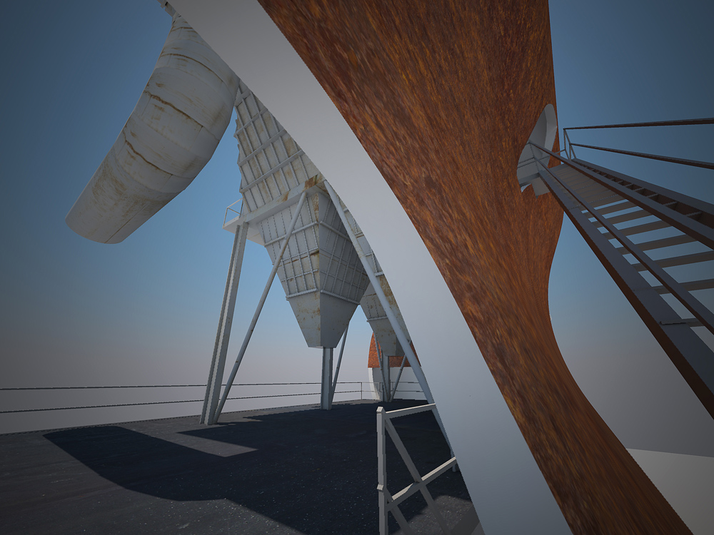 Stránka 12 a 13/15 – ti kdo netrpí závratěmi se mohou vydat výše a po druhém rameni schodiště z multifunkční roviny vystoupit vně velkého pláště, na svém konci ústícího do zářezu v něm, k vstupu do útrob filtrační jednotky. V předložených vizualizacích jsem ho prozatím pojednal jako skleněný hranol/tunel protínající napříč filtrační komoru. Pokud se ve svých odhadech nemýlím, měly by být v těchto částech elektrolytické membrány/plásty, které při nabití elektřinou katalyzovaly jedovaté zplodiny koksárenských plynů. Pokud to bude možné rád umožním návštěvníkům se mezi nimi projít, pokud ne, tak si je pouze prohlédnout při procházení skleněným tunelem do čelní části jednotky. Jak zmiňuji ve svých tištěných prezentačních panelech, tuto část možno pojednat jako jednu ze zastávek prohlídek naučných exkurzí po areálu, nebo jako originální instalaci za použití denního světla (skrze celkový vizuální vzhled jednotky nerušící okénka v plášti), umělého světla a zvuku.