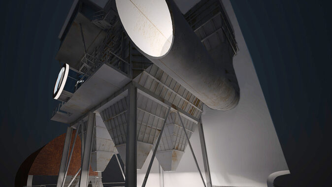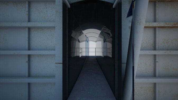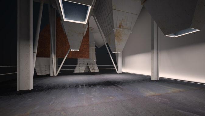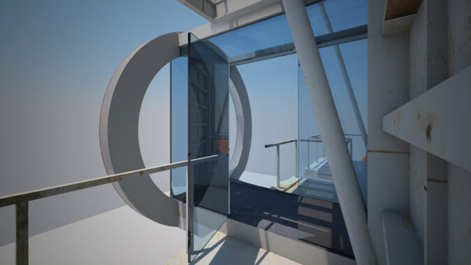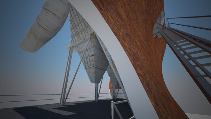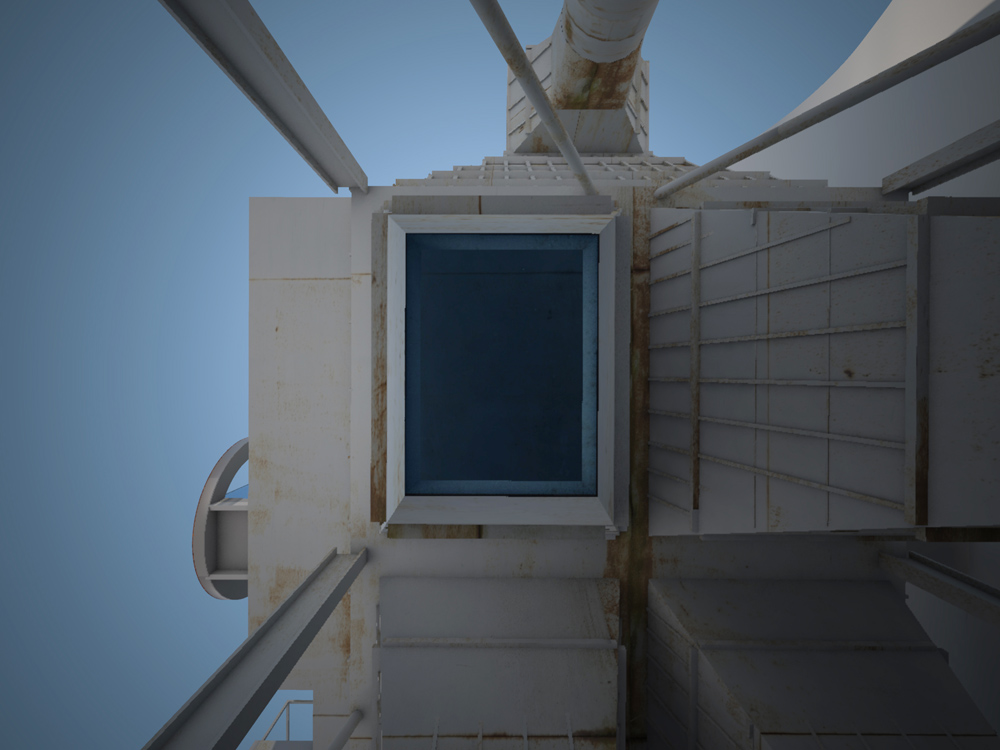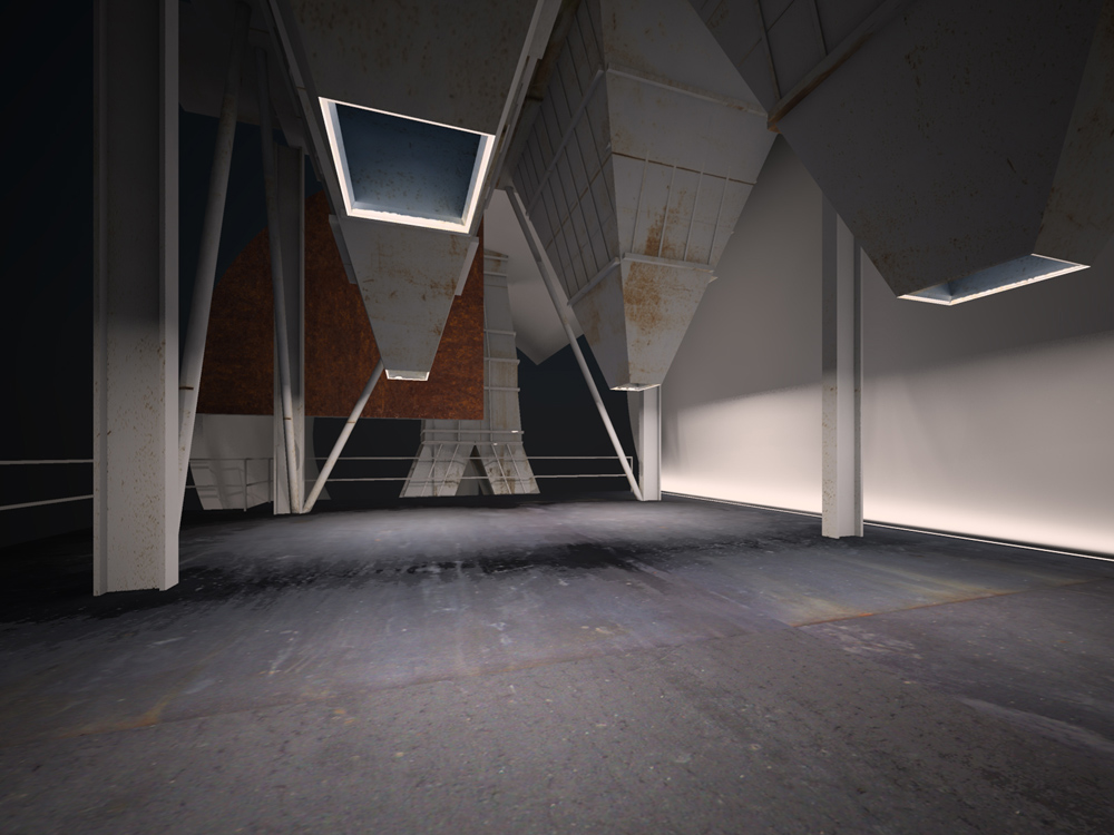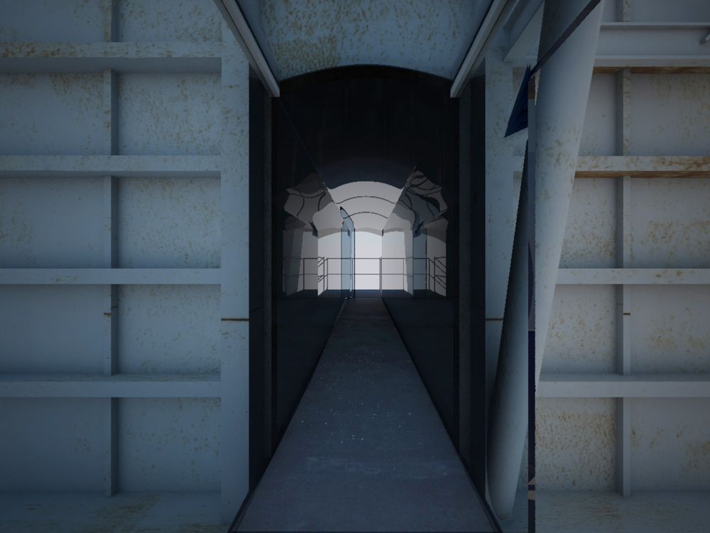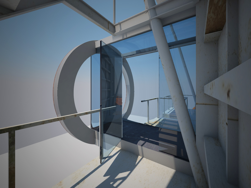 Stránka 12 a 13/15 – ti kdo netrpí závratěmi se mohou vydat výše a po druhém rameni schodiště z multifunkční roviny vystoupit vně velkého pláště, na svém konci ústícího do zářezu v něm, k vstupu do útrob filtrační jednotky. V předložených vizualizacích jsem ho prozatím pojednal jako skleněný hranol/tunel protínající napříč filtrační komoru. Pokud se ve svých odhadech nemýlím, měly by být v těchto částech elektrolytické membrány/plásty, které při nabití elektřinou katalyzovaly jedovaté zplodiny koksárenských plynů. Pokud to bude možné rád umožním návštěvníkům se mezi nimi projít, pokud ne, tak si je pouze prohlédnout při procházení skleněným tunelem do čelní části jednotky. Jak zmiňuji ve svých tištěných prezentačních panelech, tuto část možno pojednat jako jednu ze zastávek prohlídek naučných exkurzí po areálu, nebo jako originální instalaci za použití denního světla (skrze celkový vizuální vzhled jednotky nerušící okénka v plášti), umělého světla a zvuku.
