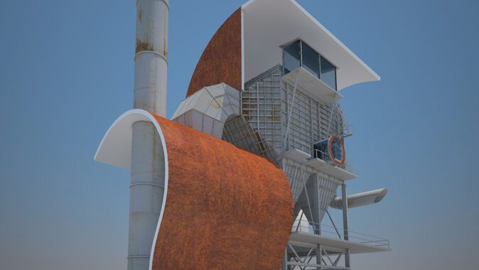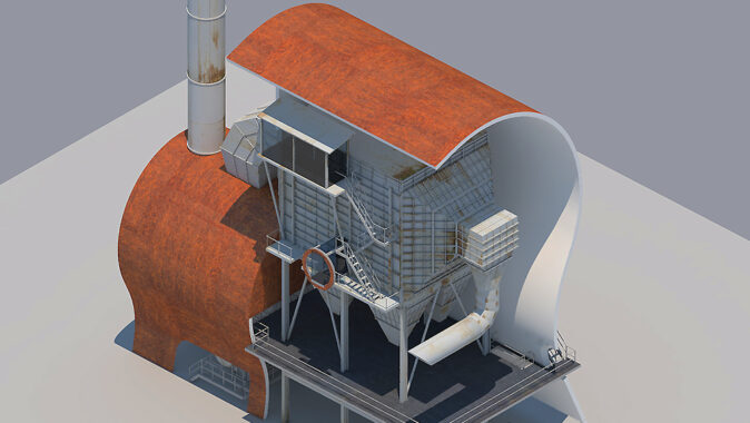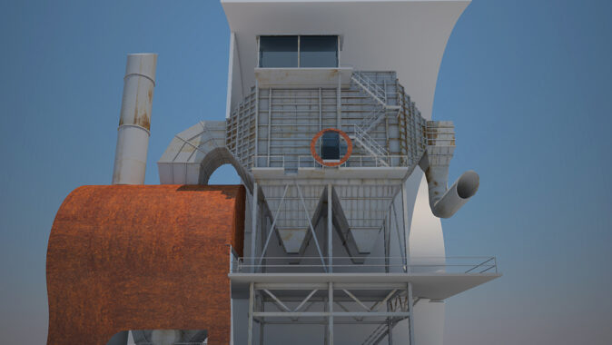 Prvně si celý objekt prohlédneme jako celek, jedná o stránky 01 až 05/15 přiloženého PDF dokumentu. Pokud se nejedná o památkově chráněné části objektu, navrhuji vybourání vše stěnových částí v přízemí objektu filtrační jednotky a zbourání cihlové budovy v její těsné blízkosti zezadu. Dostaneme tak čistou konstrukci celé jednotky, kterou poté „zahalím“ do pláště (kápě) o dvou částech. Ta větší vytvoří bílá záda filtrační části jednotky a to v pohledu od Gongu. Druhá menší, opačně orientovaná, zahalí potrubní dmychadlo s elektromotorem, který nasával vzniklé plyny z koksárny do filtrační částí a „vydechoval“ je přefiltrované do u něj stojícího komínu. Obě části opláštění budou založeny na principu kokosové skořápky. Strany na venek budou ponechány oxidaci, tedy zrezlé, ošlehané dešti a spady prachu. Vnitřek bude hladký, čistě bílý a v detailech zaoblený a měkký. Měl by být udržován a čas od času umyt. Samotná filtrační jednotka se ponechá ve stávajícím stavu, pouze povrch zakonzervuje, tak aby zastavil korozi všech částí.