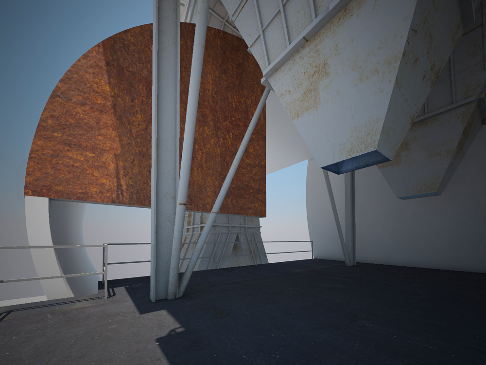 Stránka 08 až 11/15 – vystoupili jsme po jednoramenném schodišti na úroveň vrchní části stávajícího konstrukčního a příhradového pásu pod filtrační jednotkou. Zde bych vložil multifunkční plošinu pro pozdější libovolné použití, která zároveň bude střechou nově vzniklého prostranství pod ním. Tato nová plošina se bude nacházet v těsné blízkosti výsypek filtru a na své straně opačné straně vůči vyústění schodiště z přízemí, bude zabíhat až po vrchní vykroužení menšího pláště a jeho čtvrtkruhové bočnice