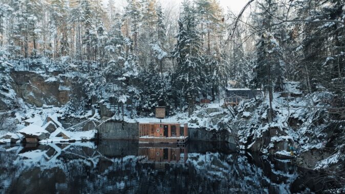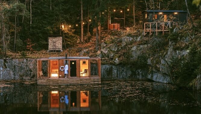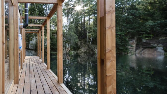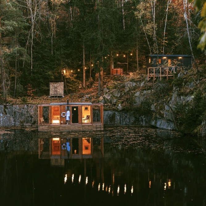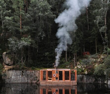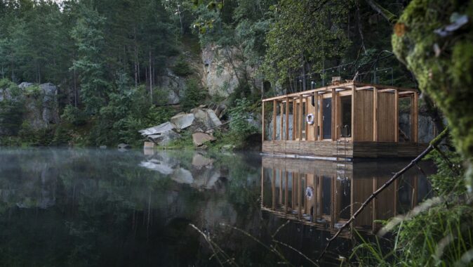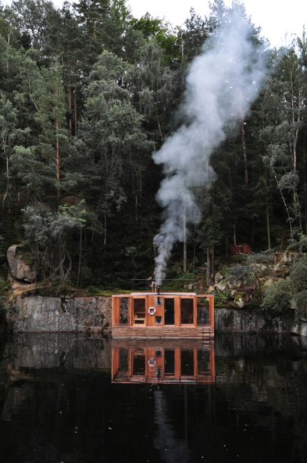 Návrh sauny ovlivnilo zejména místo samotné a jeho specifická uzavřenost a tajuplnost. Klient definoval rozsah zadání a naším hlavním úkolem bylo nalézt správné měřítko pro plavidlo – objekt. Právě kvůli ideálním rozměrům jsme se rozhodli utilitární typologii doplnit o vnější ochoz, který je spíše sporadicky definován subtilním modřínovými prvky. Modřínová fasáda, spodní paluba, horní paluba a schodiště jsou prvky vnějšího pláště objektu, které budou postupem času stříbřit estetiku plavidla dobrým směrem. Je pravděpodobné, že časem bude vypadat ještě lépe než nyní.