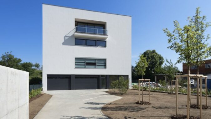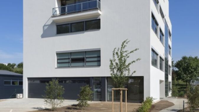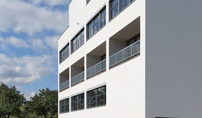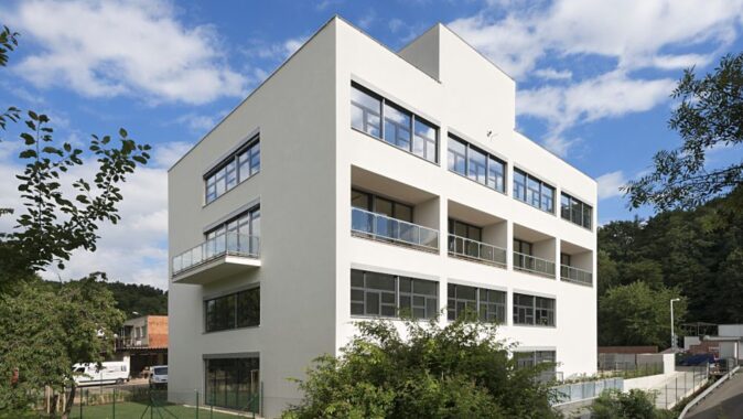 Vstup a vjezd na pozemek je z jižní strany z ulice Pod Stárkou. Stavba má jedno podzemní a pět nadzemních podlaží. Poslední podlaží bylo navrženo jako ustupující. 1. PP je využito kromě garáží (14 stání) jako technické zázemí objektu, 1. NP tvoří garáž (4 stání), letní pracovna, dva ateliéry a byt, 2. NP je využito pro administrativu, ve 3. NP se nachází pět bytových jednotek. Ve 4. NP jsou dva byty a v 5. NP ateliéry navazující na byty ve 4. NP.