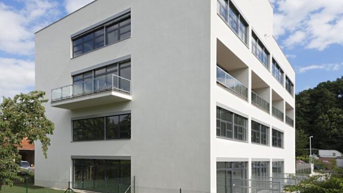 Budova navazuje ze západu na hmotově obdobnou zástavbu činžovních vil v