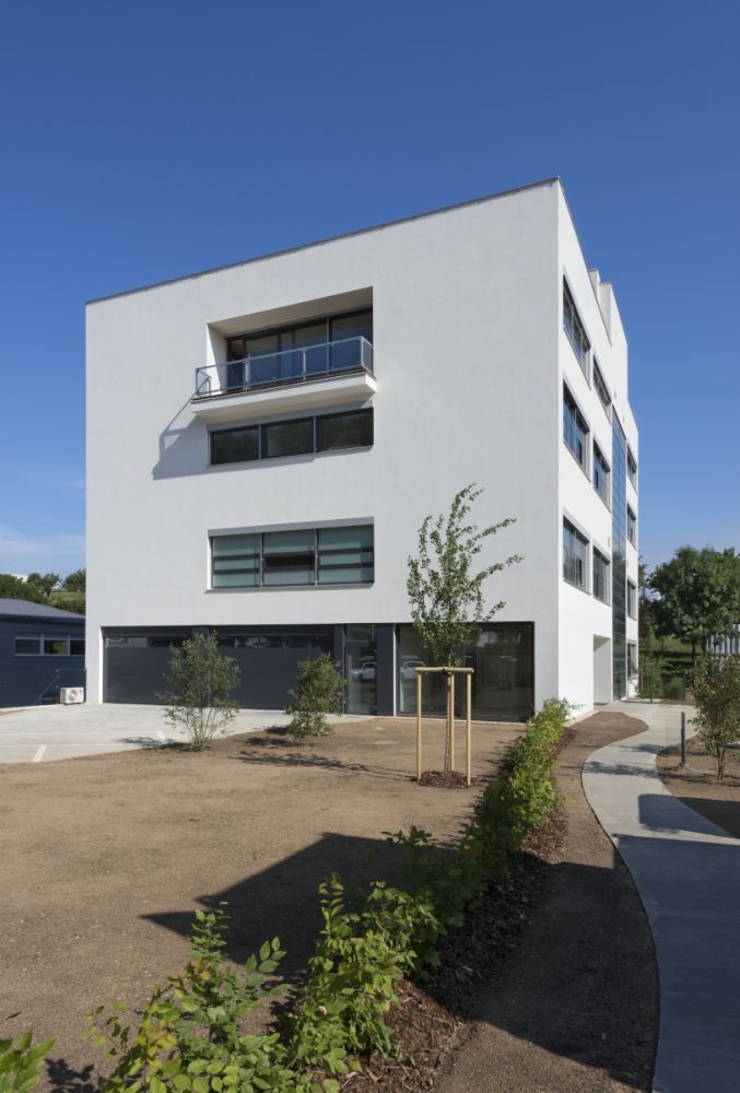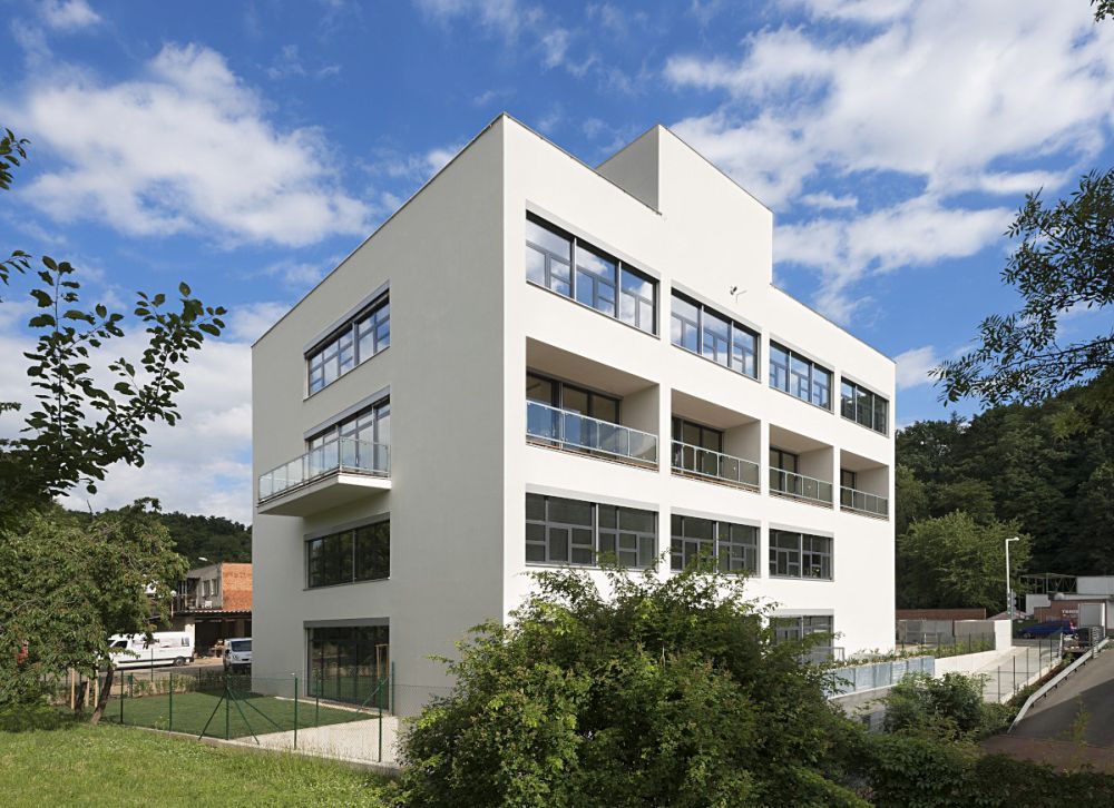 Budova navazuje ze západu na hmotově obdobnou zástavbu činžovních vil v
