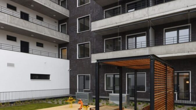 administrativu v 2. NP. a dvaatřicet bytů ve 3.–8. NP. V 1. PP jsou