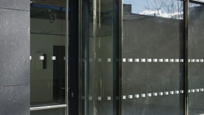stylu. Na fasádě jsou v pravidelném rastru uspořádána velká okna do