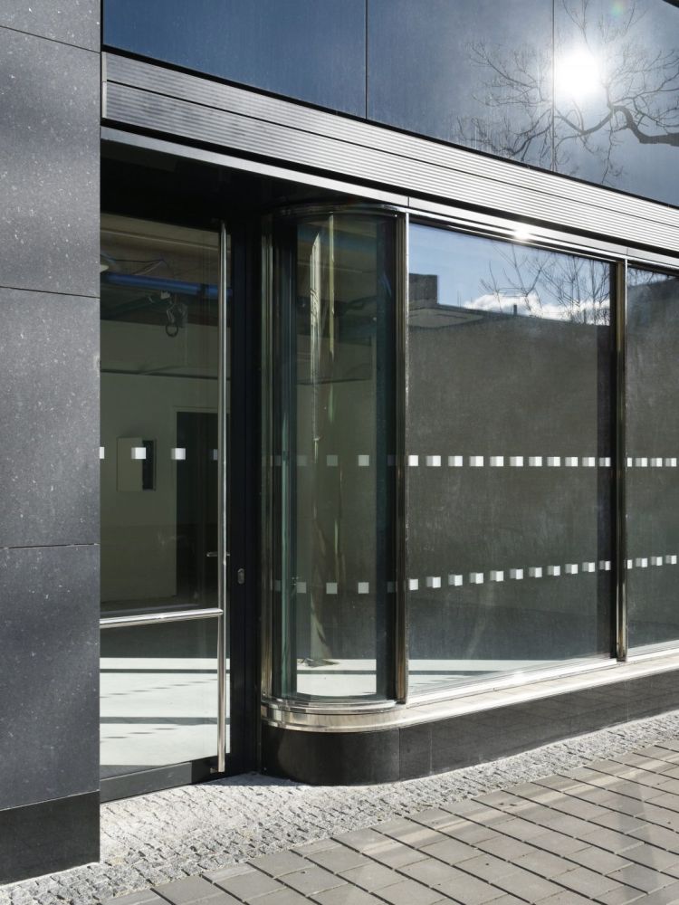 Dvoupodlažní parter je obložen černou žulou, výkladce jsou opatřeny