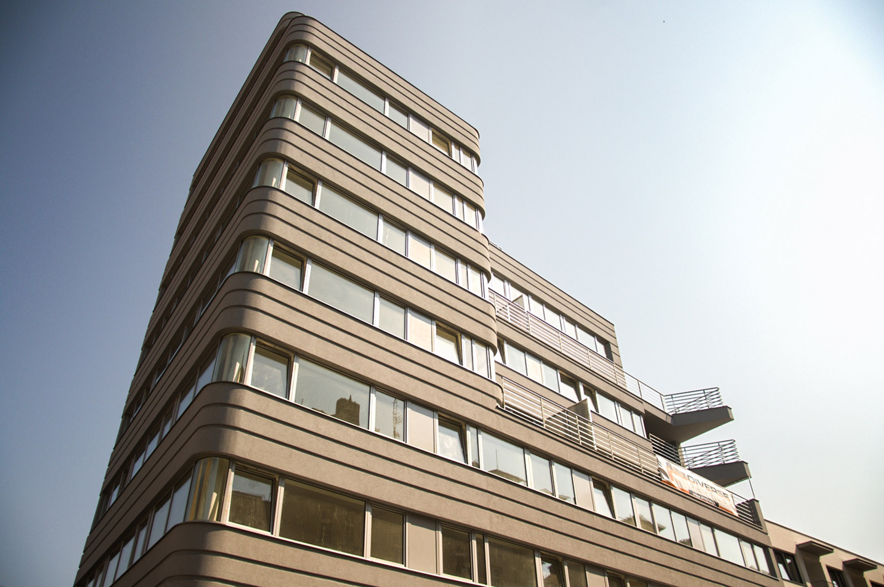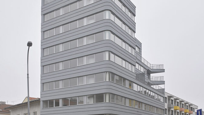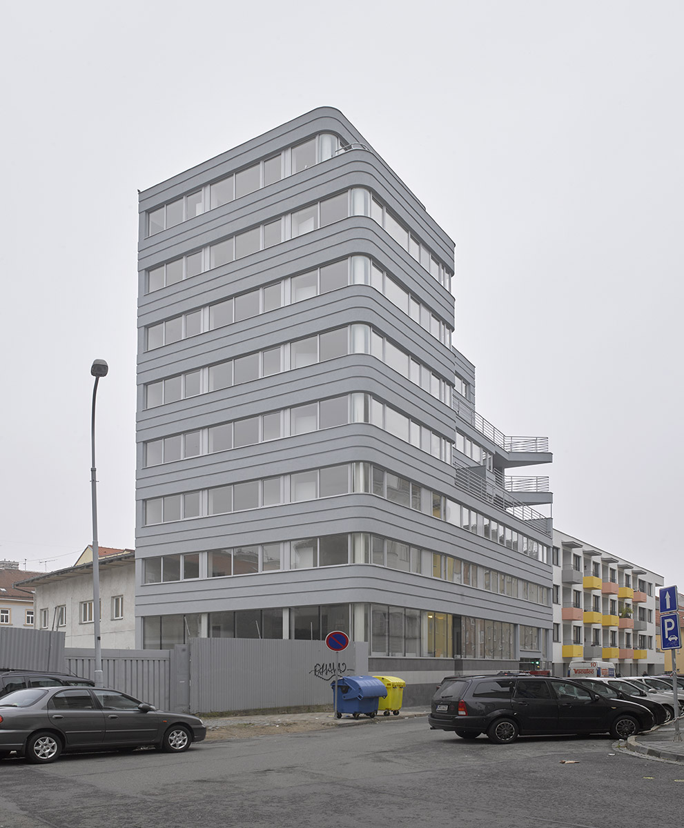 Polyfunkční dům vyplňuje mezeru v proluce a vytváří nynější nároží.