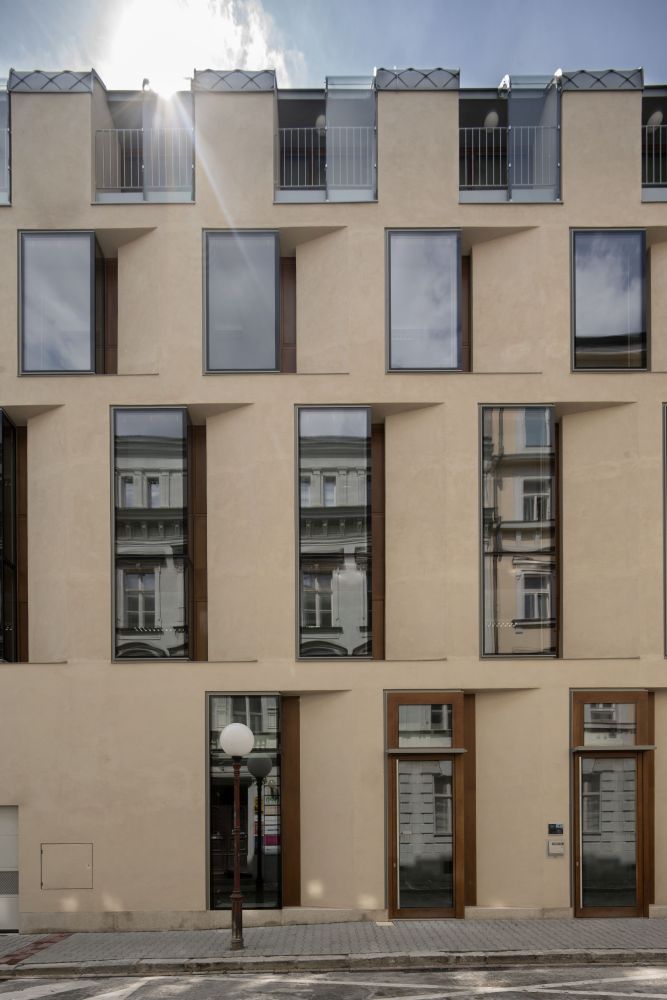 Fasáda do dvora je v detailu jednodušší podobně jako u sousedních domů. Důraz