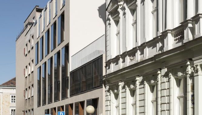místa a zároveň stavbu identifikují jako současnou. Okolní historické objekty mají
