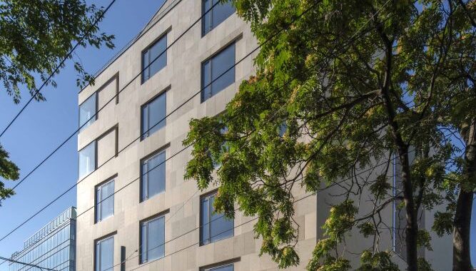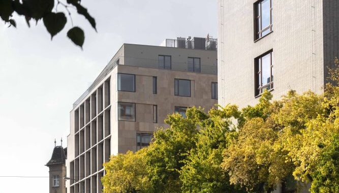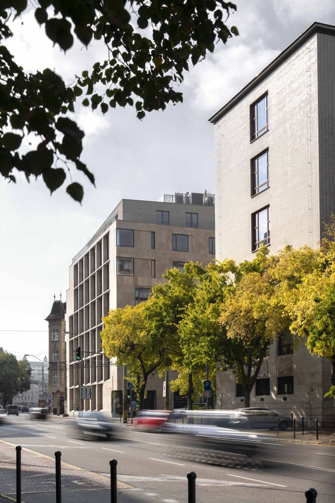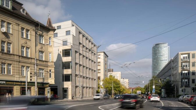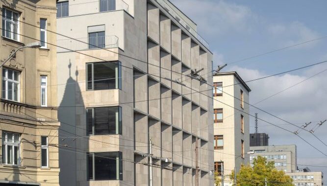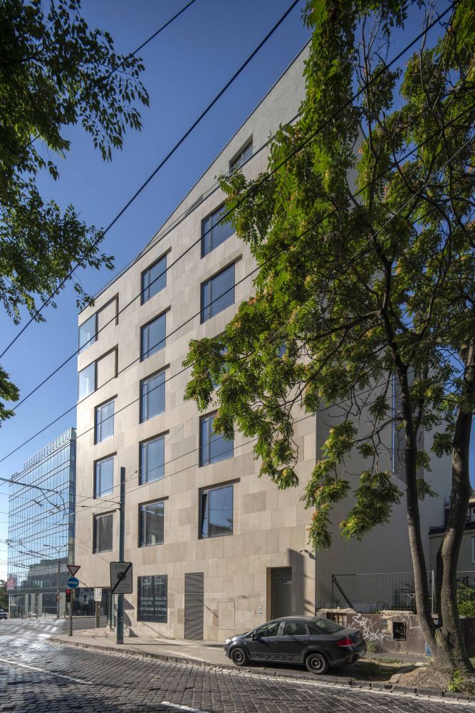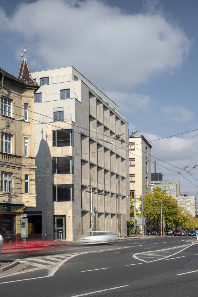 Fasádu domu v podstatě tvoří jednoduchá šikmina okenního ostění, která reaguje na křivku ulice. Paradoxem je, že sice působí jako kamenný masiv, ale zároveň je vyskládaná z okenních otvorů, které odděluje jemná horizontála betonového prefabrikátu.