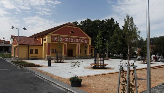 fasád radnice a spořitelny ve formě dvou sloupů a reliéfního prahu v úrovni