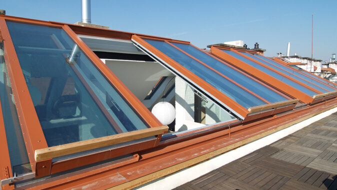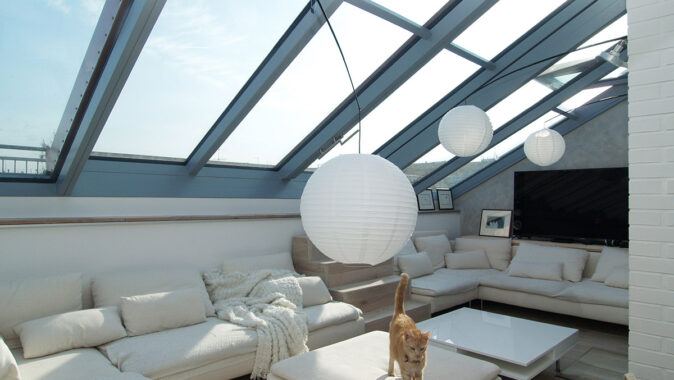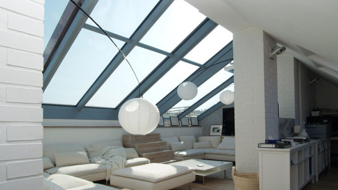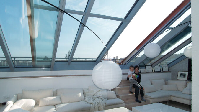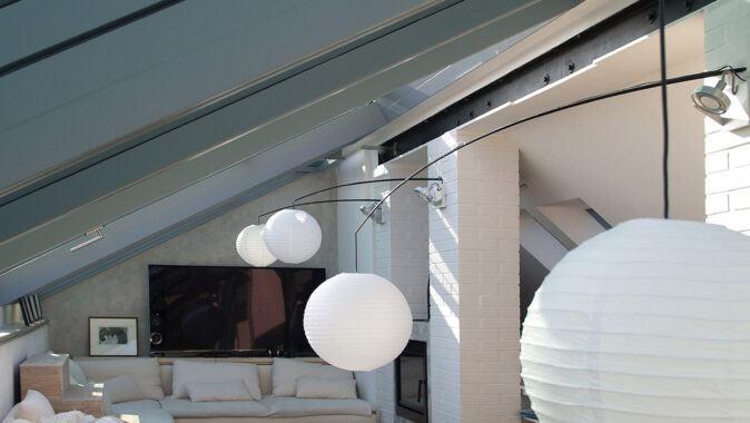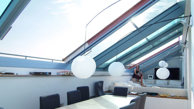 Posuvné střešní prosklení Solara PRESPEKTIV propojuje podkroví s okolním světem nad střechami a otevírá prostor jedinečným způsobem. Velké plochy prosklení se dají odsunout do strany nad pevně prosklené části a z bytu vytvořit exkluzivní venkovní posezení nad střechami. Po odsunutí prosklení se dá pohodlně vyjít na venkovní terasu, která podstatně rozšiřuje užitnou plochu podkrovního bytu.