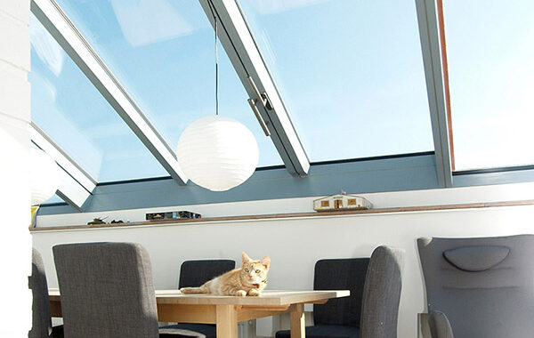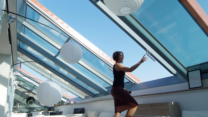 Výjimečné střešní okno Solara s opravdu velkými posuvnými plochami. Design, trojité zasklení, chytré stínění i řešení posuvných částí je výsledkem konzultací Solary s majitelem-architektem.