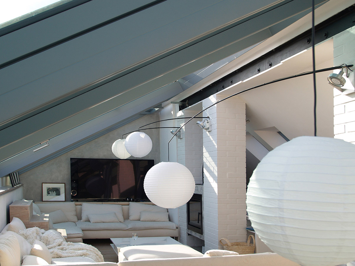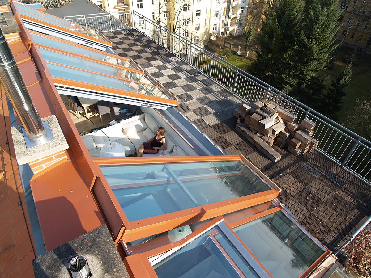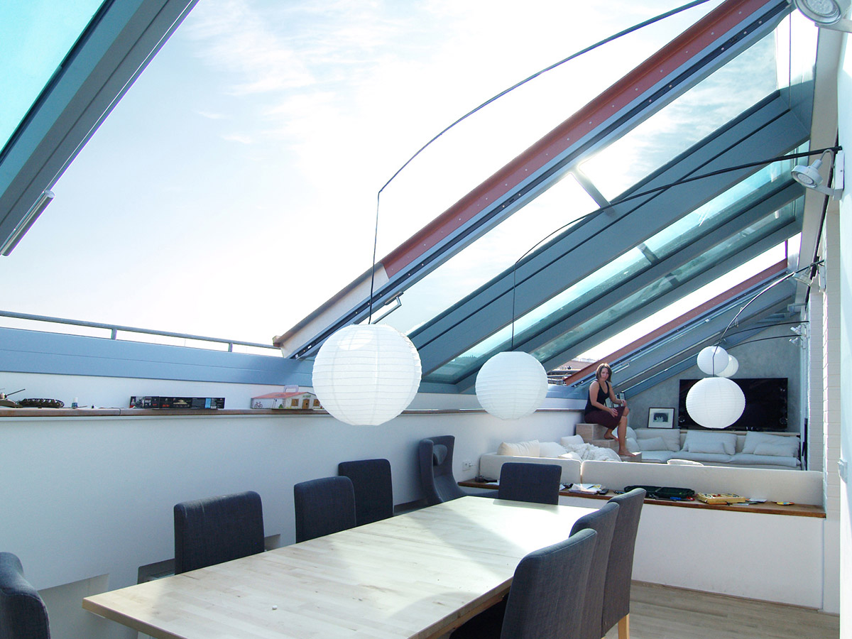 Posuvné střešní prosklení Solara PRESPEKTIV propojuje podkroví s okolním světem nad střechami a otevírá prostor jedinečným způsobem. Velké plochy prosklení se dají odsunout do strany nad pevně prosklené části a z bytu vytvořit exkluzivní venkovní posezení nad střechami. Po odsunutí prosklení se dá pohodlně vyjít na venkovní terasu, která podstatně rozšiřuje užitnou plochu podkrovního bytu.