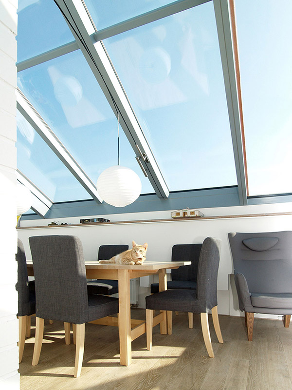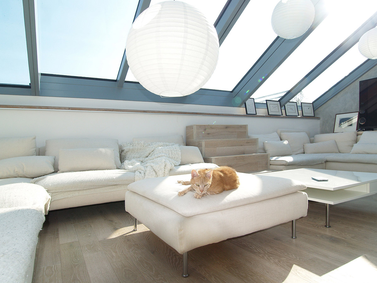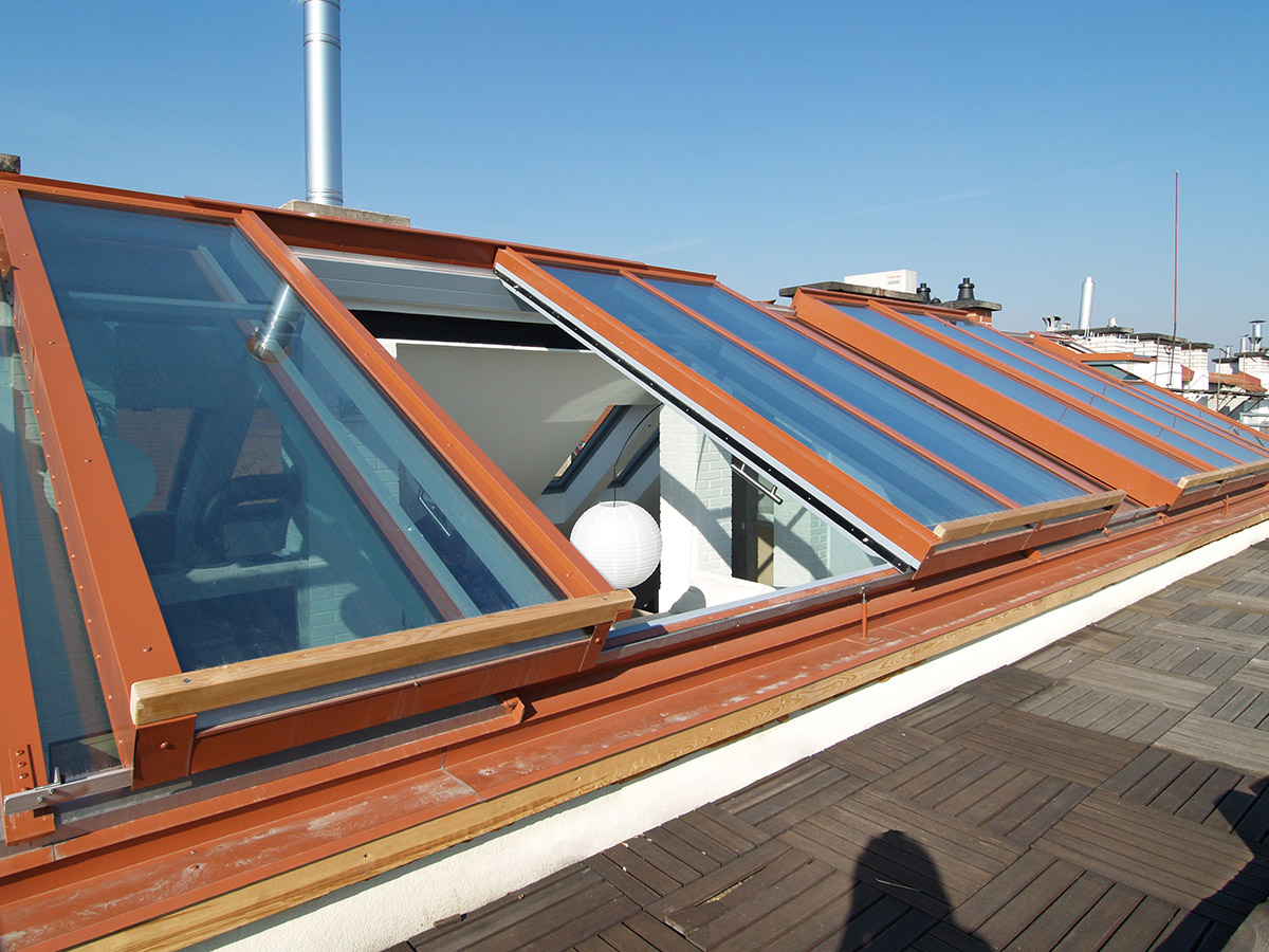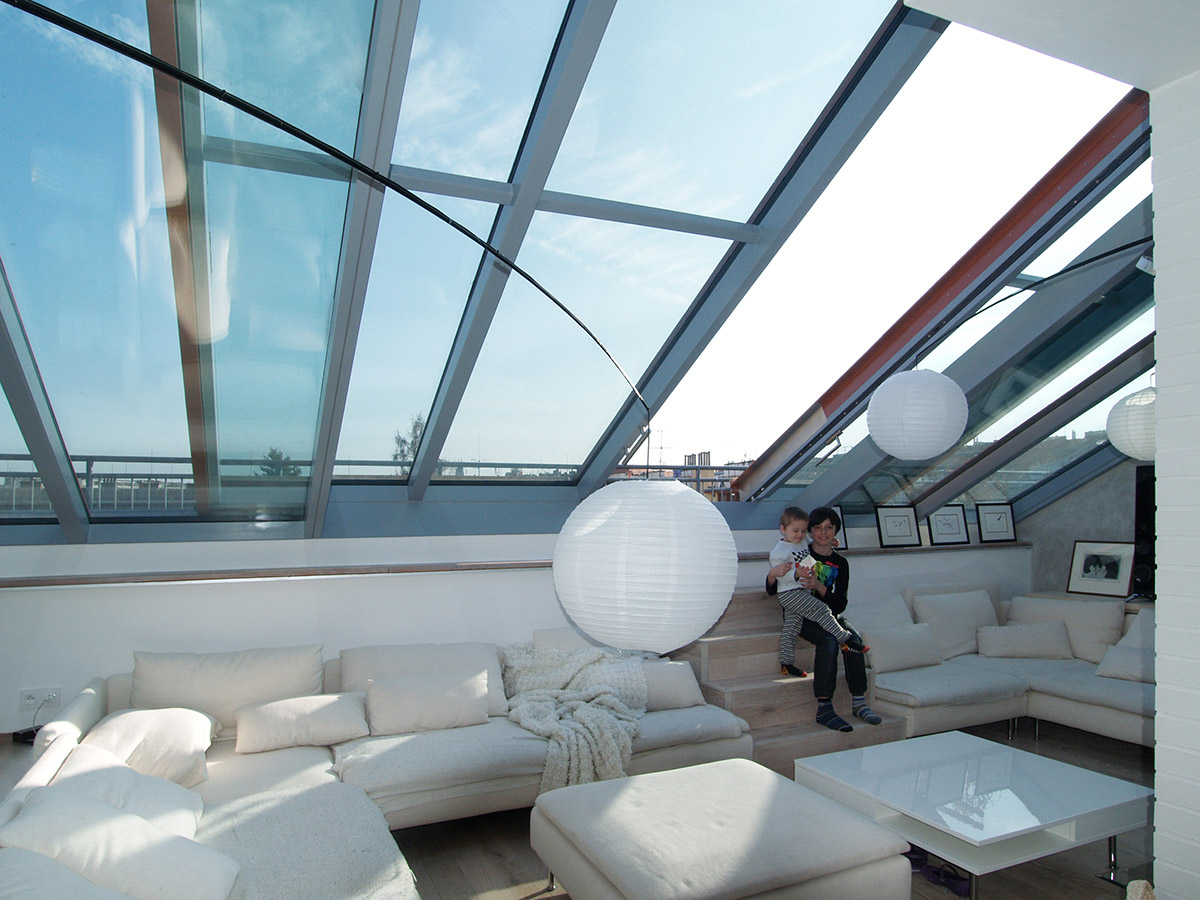 Posuvné střešní prosklení Solara PRESPEKTIV propojuje podkroví s okolním světem nad střechami a otevírá prostor jedinečným způsobem. Velké plochy prosklení se dají odsunout do strany nad pevně prosklené části a z bytu vytvořit exkluzivní venkovní posezení nad střechami. Po odsunutí prosklení se dá pohodlně vyjít na venkovní terasu, která podstatně rozšiřuje užitnou plochu podkrovního bytu.