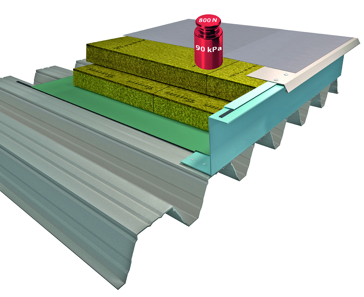 – izolace HARDROCK MAX zajistí vynikající mechanické vlastnosti izolačního souvrství; konstrukce dvouvrstvé střešní desky HARDROCK MAX a její horní tuhá vrstva zabezpečuje vynikající mechanickou odolnost (bodové zatížení 800 N, napětí v tlaku při stlačení desky 70 kPa a při stlačení horní vrstvy desky 90 kPa).