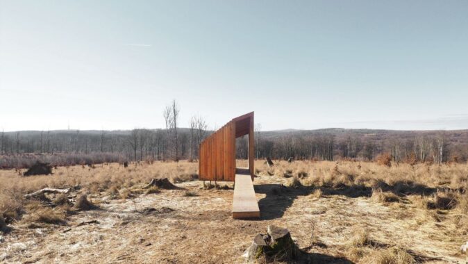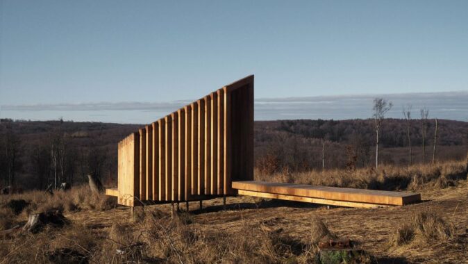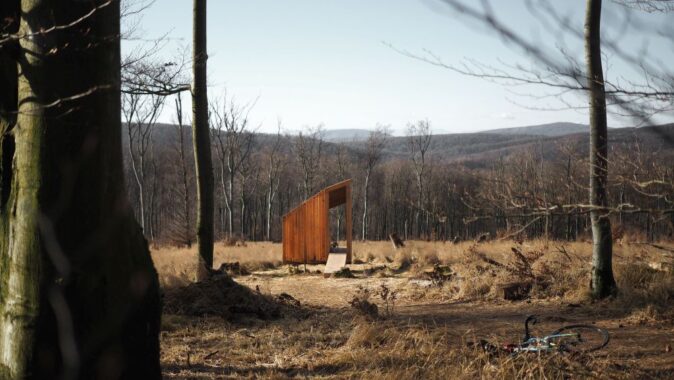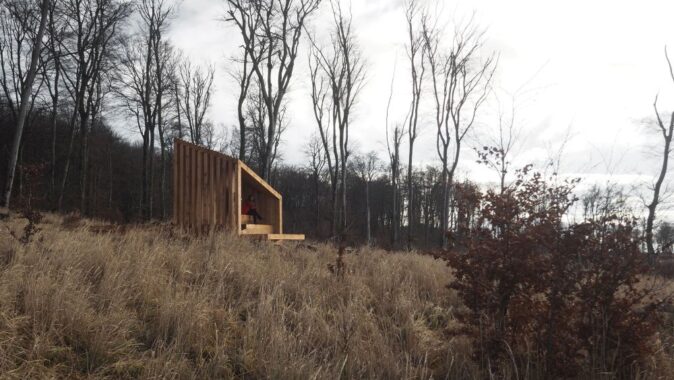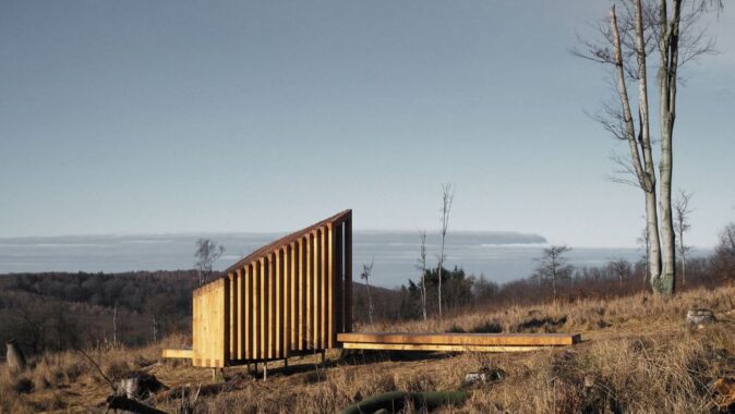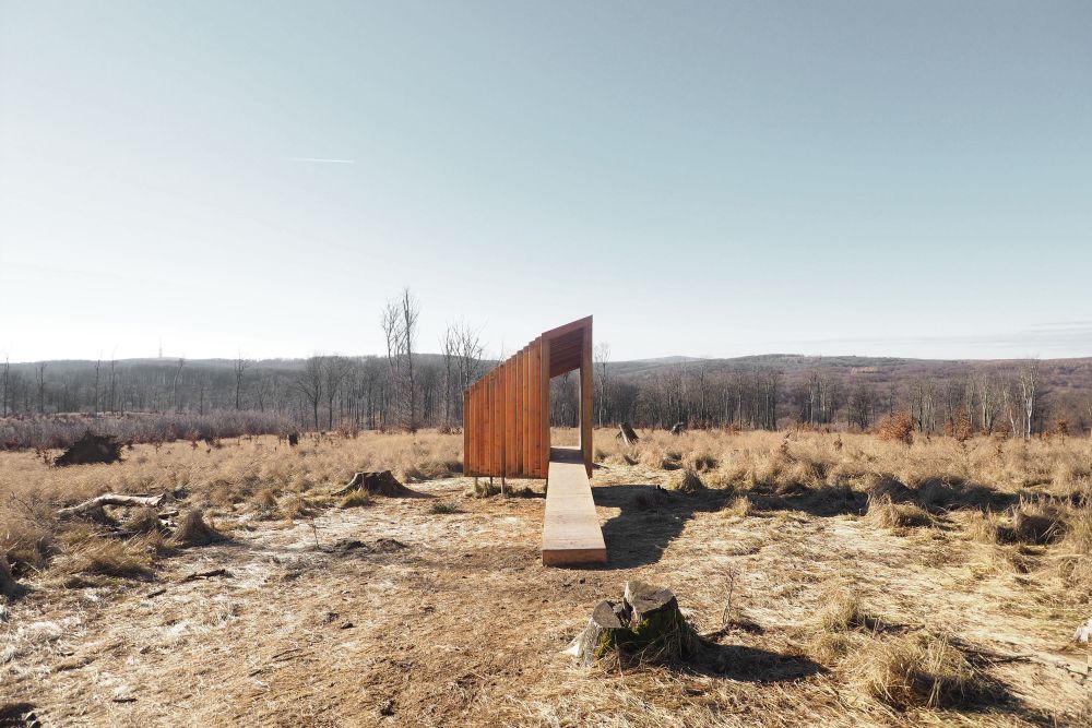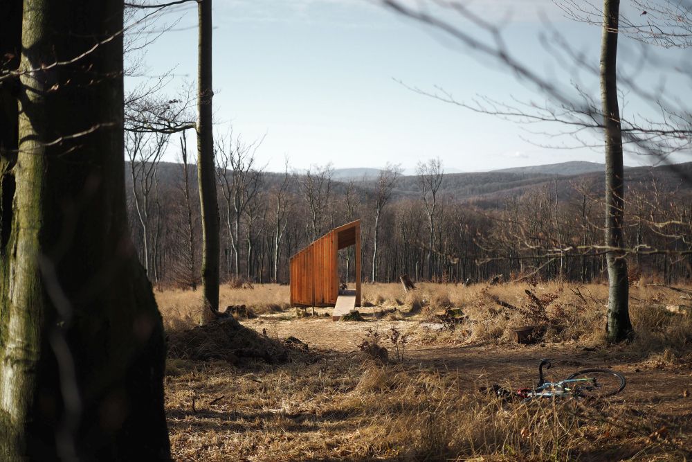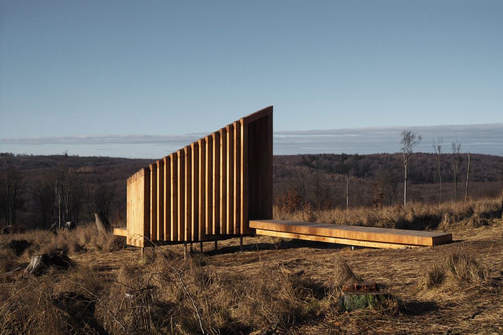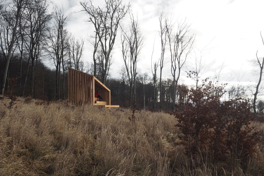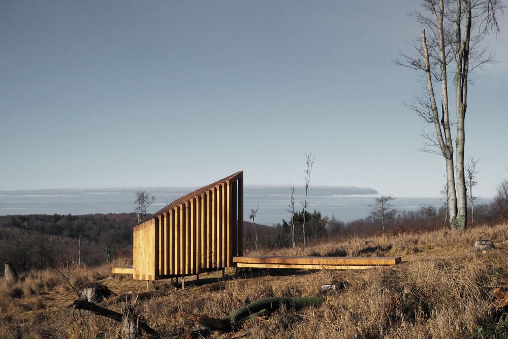 Drobná dřevostavba slouží pro posezení i jako úkryt před nepřízní počasí. Lávka návštěvníka přivádí ke v stupu, za nímž se mu otevře terasovité plato. Výhled vymezují asymetrická konstrukce střechy a stěny.