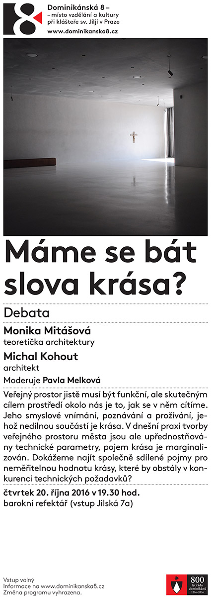 Veřejný prostor jistě musí být funkční, ale skutečným cílem prostředí okolo nás je to, jak se v něm cítíme. Jeho smyslové vnímání, poznávání a prožívání, jehož nedílnou součástí je krása. V dnešní praxi tvorby veřejného prostoru města jsou ale upřednostňovány technické parametry, pojem krása je marginalizován. Dokážeme najít společně sdílené pojmy pro neměřitelnou hodnotu krásy, které by obstály v konkurenci technických požadavků?