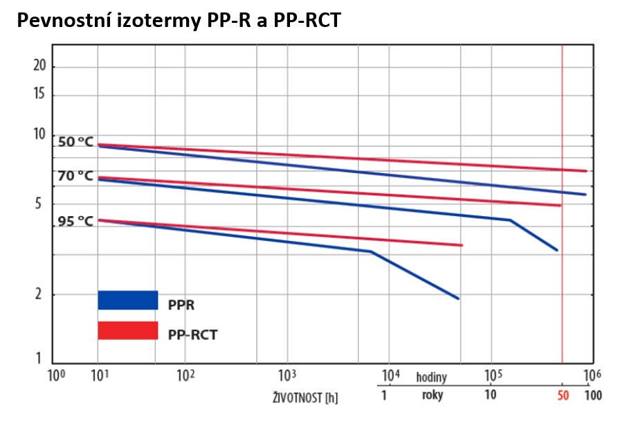 Nový typ polypropylénu má nejen vyšší tlakovou odolnost při vyšších teplotách média (od 70°C výše), ale také dlouhou životnost. Ta je charakterizována v závislosti na teplotě a tlaku media tzv.„životnostními“ křivkami – izotermy. Zatímco tvar křivek materiálu PP-R je pro teploty nad 70°C lomený a dochází k rapidní snížení tlakové odolnosti a životnosti trubek, křivky materiálu PP-RCT mají vždy lineární průběh, stejně jako například křivky síťovaného polyethylenu (PEX).
