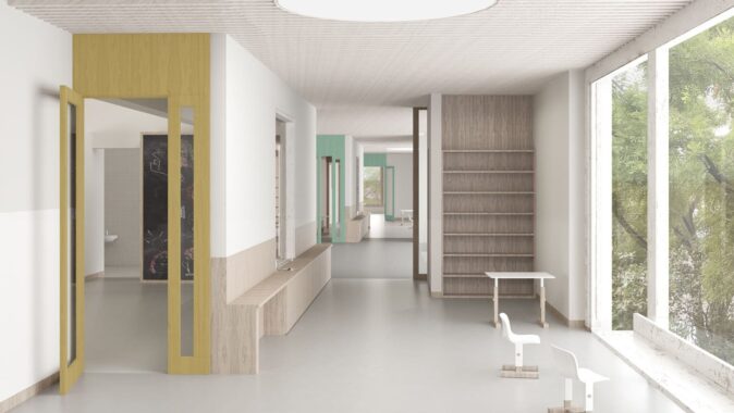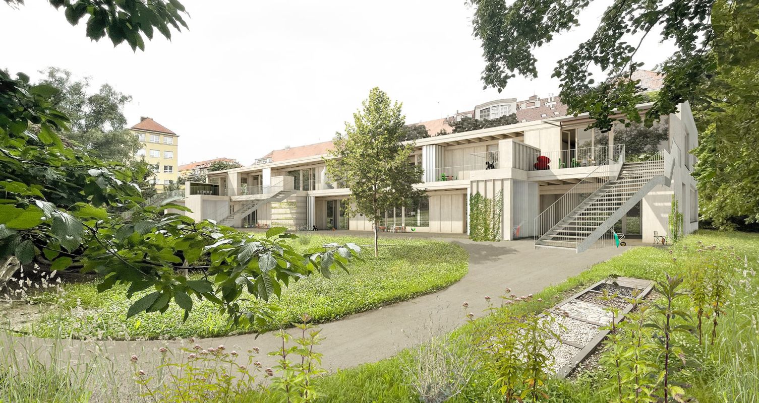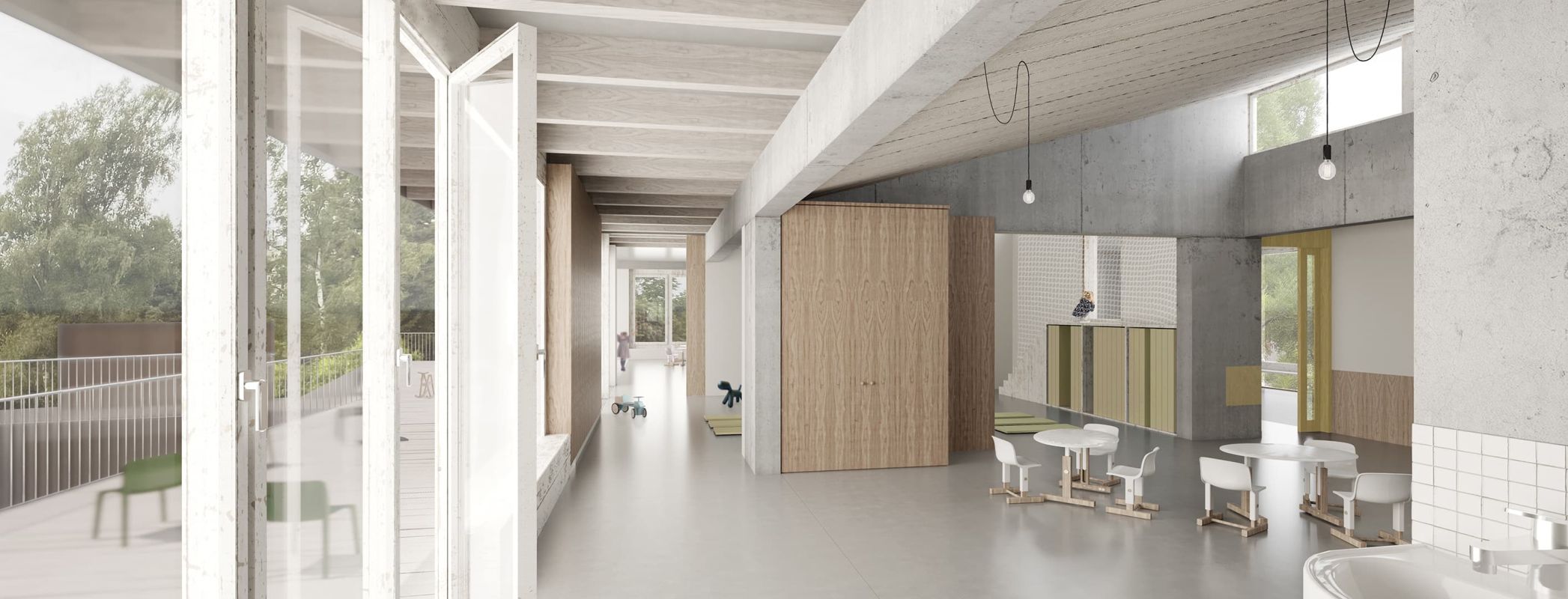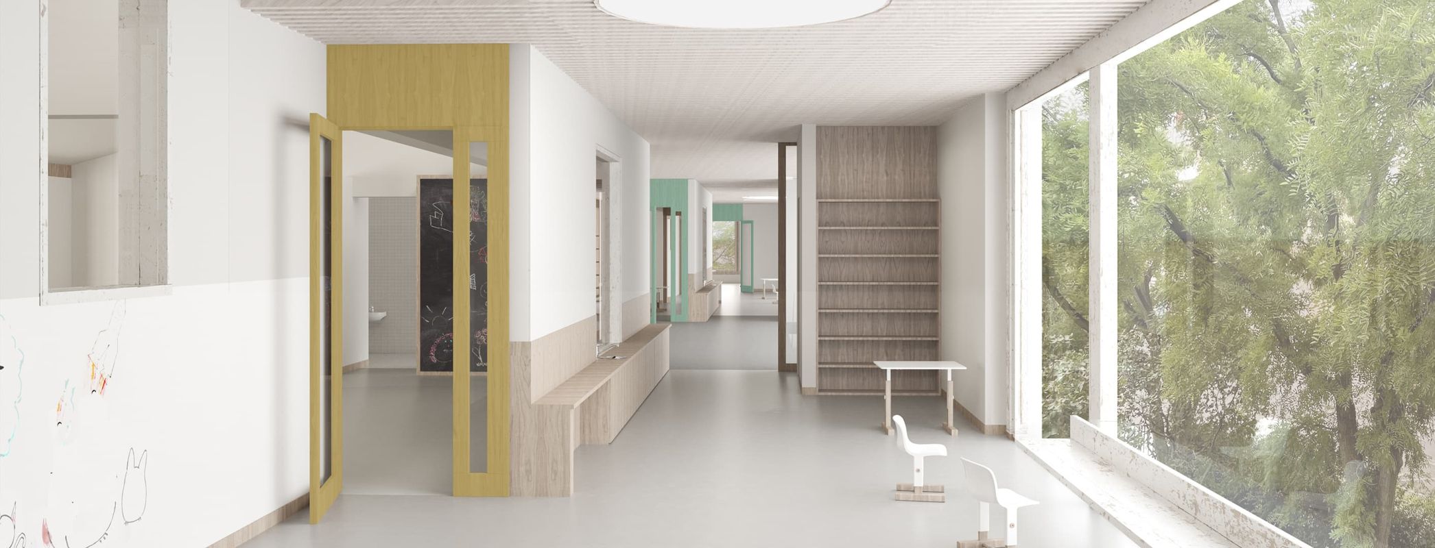 „Všechny třídy výhodně orientujeme vůči jihovýchodnímu slunci a zároveň intimnímu výhledu do celého prostoru zahrady, lemované po obvodu vzrostlými stromy, které ji přirozeně oddělují od okolního města. Prostorné terasy propojují interiér se zahradou, umožňují venkovní výuku a setkávání dětí z vedlejších tříd. Směrem do ulice je výraz školky civilní a symetrická severní fasáda jasně definuje vstup,“ popisuje spoluautorka návrhu architektka Radka Kurčíková. „Zásadní bylo vytvořit rozmanité vnitřní prostory pro pobyt dětí a zároveň dosáhnout tvarově jednoduchého kompaktního objemu, jako základní podmínky pro dosažení nízkých investičních nákladů na výstavbu, ale i budoucího provozu moderní školky,“ doplňuje Kurčíková.