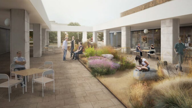 řešení, zeleně, použitého mobiliáře a svítidel.