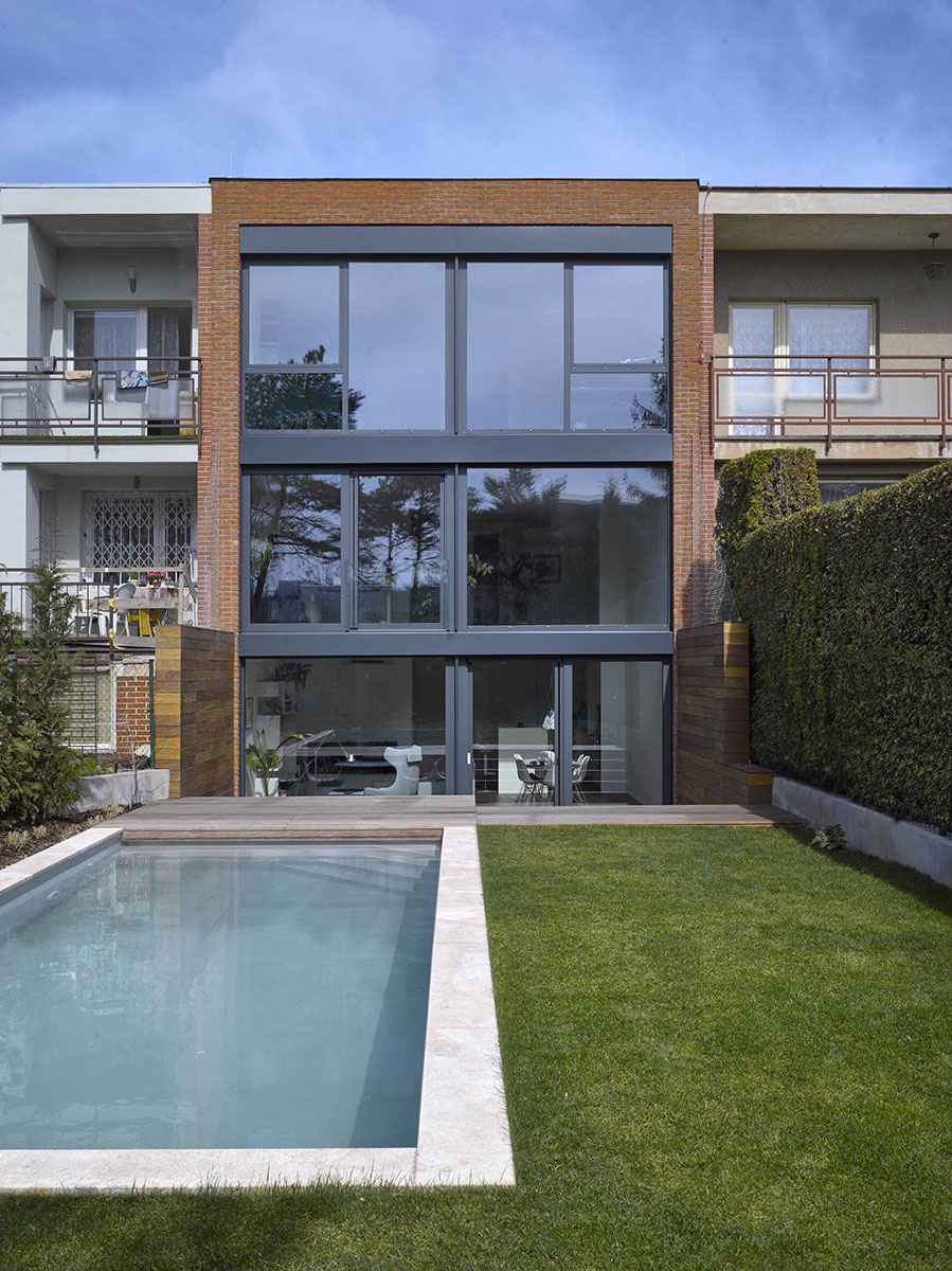 V sedmdesátých letech minulého století byly ve čtvrtích Hanspaulka a Baba vystavěny řadové a bytové domy. Stejně jako v jiných částech Československa, byla bytová výstavba řešena formou svépomocí v rámci, pro tento účel založených, družstev. Výstavba respektovala typizaci své doby, nicméně svažitý reliéf Hanspaulky přinášel zajímavé modifikace. V našem případě měl dům suterén, ze kterého byl díky terénnímu zlomu vstup na zahradu, zatímco vstup z ulice byl o podlaží výše. Po technické stránce byl dům navržen z plných cihel na rozpony panelových stropů, bylo tedy nutné se vyrovnávat s velmi úzkou dispozicí. Charakteristické pro naši oblast bylo použití cihel na fasádě. Jasně vymezené hranice společně se zadáním investora nám určili směr přestavby. Pro navýšení obytné plochy, jsme využili k bydlení i suterén napojený na zahradu. Velmi nízké světlé výšky podlaží nás motivovaly provzdušnit dispozici otevřením jídelny přes dvě patra. Z jihu jsou obytné místnosti prosvětleny velkoformátovým prosklením, které tvoří de facto celou fasádu. Tepelnou pohodu zajišťují venkovní žaluzie, které jsou automaticky řízené. Z ulice – ze severu je zopakován princip z jižní fasády. Velké prosklené plochy zde však z větší části nahrazují plné plechové plochy, za nimiž je garáž a koupelna. Černo-skleněný plášť je zvýrazněn lemem z červených lícových cihel, prvku stmelujícího původní výraz domu s moderní přestavbou.