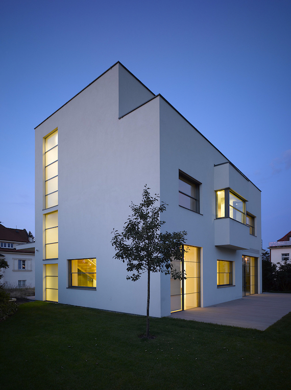 Navržený dům stojí ve vilové zástavbě Ruzyně a Liboce. Půdorysný tvar do písmene U obklopuje venkovní terasu, nabízející pobytový prostor s vysokou mírou soukromí. Dům tímto směrem hledí přes zahradu k oboře Hvězda, která je v jeho těsné blízkosti. Objekt připomínající nepravoúhlý krystal v zeleni zahrady je dvoupodlažní, částečně podsklepený, s plochými střechami a střešní nástavbou. Ústřední roli hraje v přízemí obývací pokoj, který velkými okny propojuje přední a zadní zahradu. Dále se v tomto podlaží nachází kuchyň s jídelnou a pokoj rodičů. První patro je vyhrazeno pro děti. Jejich pokoje mají výstup na střešní terasu. Výrazné materiálové řešení interiéru, užití pohledového betonu v kombinaci s dubovým dřevem, dává vyniknout přirozené kráse materiálu.