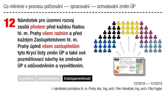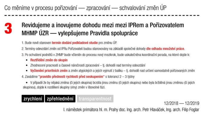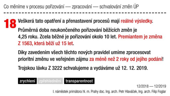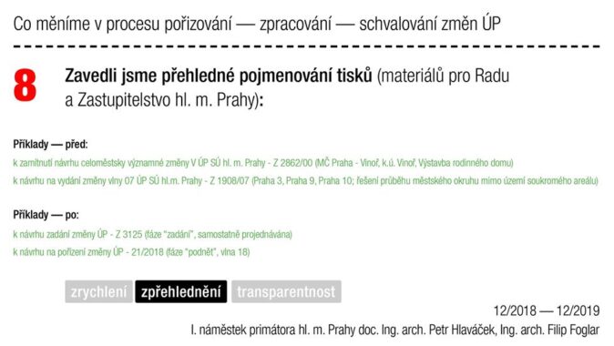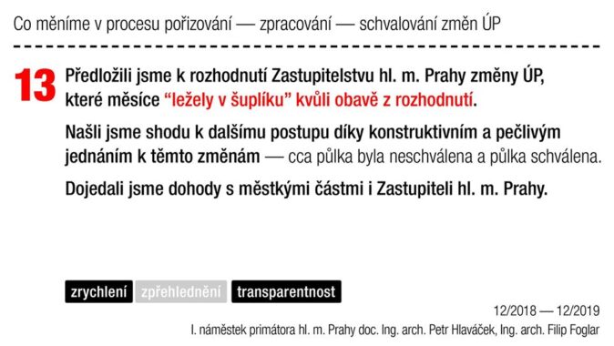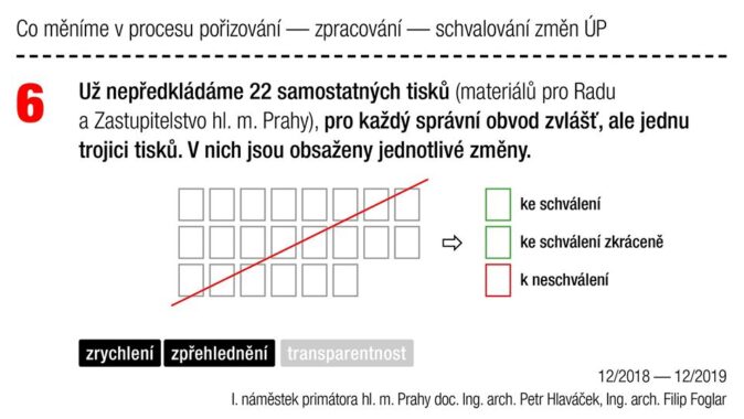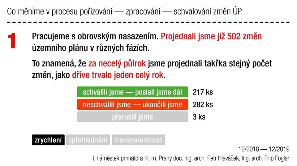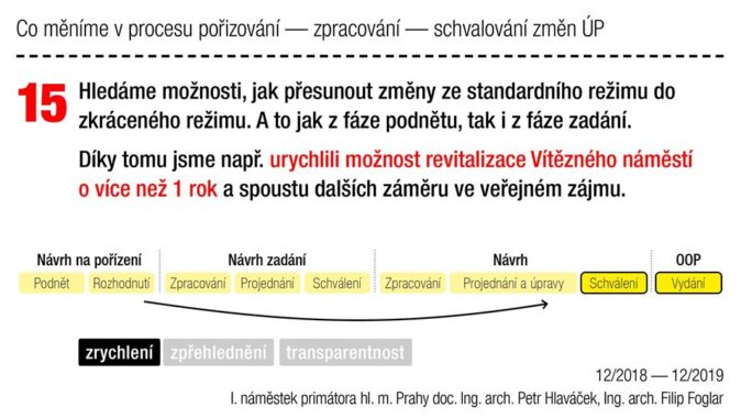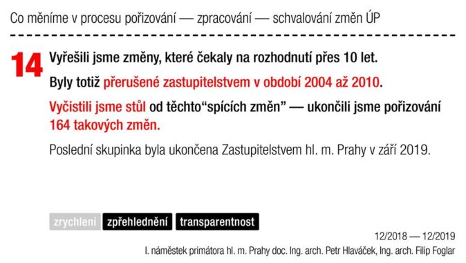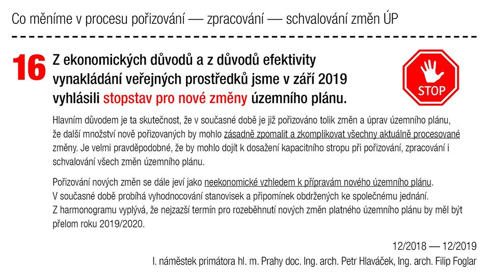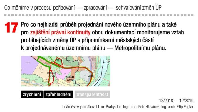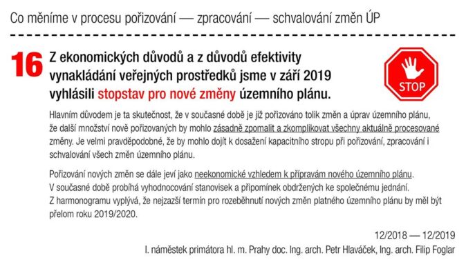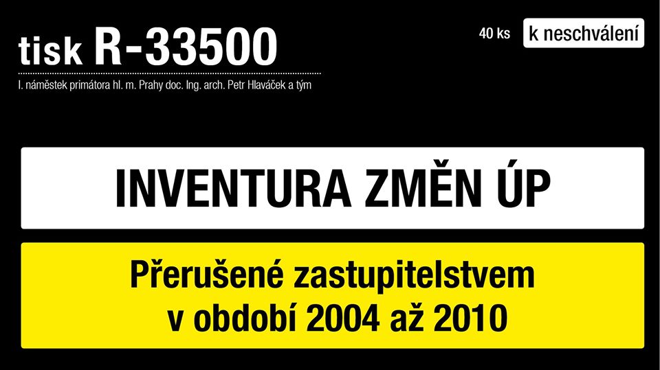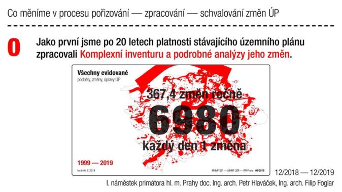 Praha zároveň zahájila inventuru všech změn územního plánu, které magistrát eviduje. „Leželo tam (na magistrátu) spousta změn, se kterými se kdokoliv bál něco dělat. Většinu jsme zastavili, byly tam zastupitelstvem přerušené změny z let 2004 až 2010, které jen překážely v šuplíku. Byla to dost archeologie,“ řekl Hlaváček.
