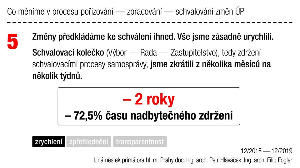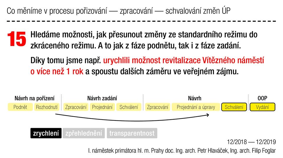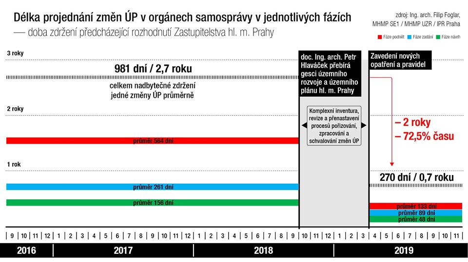 V minulosti byl dokument u radního pro územní rozvoj 564 dní. „Nyní je to 133 dní, což ale na druhou stranu také není málo,“ řekl Hlaváček. Zkrátily se rovněž fáze zadání a návrhu změny.