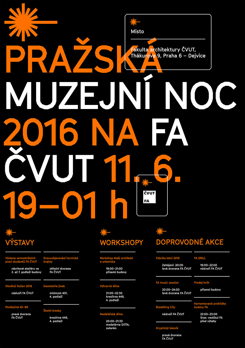 Na noční návštěvníky čekají výstavy, hudební jam session, interaktivní instalace, workshopy pro děti, výtvarné dílny nebo grilování na nádvoří FA. Otevřené budou všechny ateliéry na sedmi podlažích, kde sami studenti představí projekty, na kterých v letním semestru pracovali.