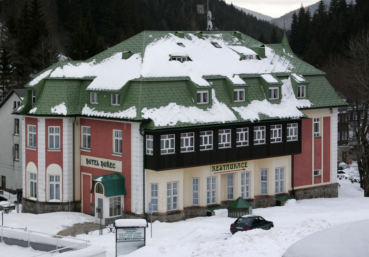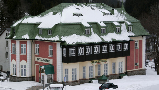 střechy horského hotelu Hořec v Peci pod Sněžkou, která získala v rámci
