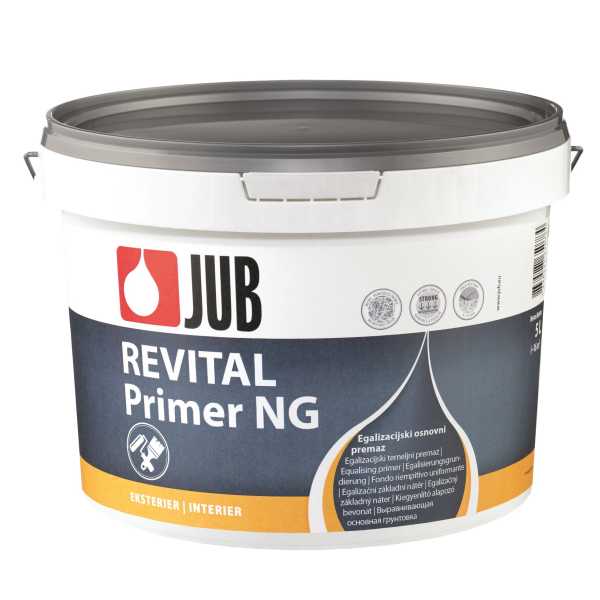 3) Vysušené dezinfikované fasádní povrchy se posléze natírají vodou ředitelným základním nátěrem JUB REVITAL Primer EXTRA, který je vyrobený na základě polymerních pojiv, plněný mikrovlákny a jemným křemičitým pískem, a který odolává napadení nejrozšířenějšími druhy řas a plísní. Současně účinně zakrývá trhliny šířky do 0,3 mm (na větší trhliny použijeme REVITAL Crack repair), podklad sjednocuje z hlediska hrubosti a savosti a váže prachové a jiné nesoudržné částice, které nebylo možné čištěním odstranit.