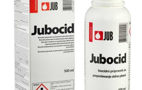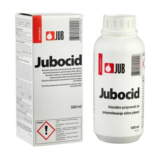 2) Následuje dezinfekce – odstranění řas a plísní z povrchu pomocí bezbarvého biocidního prostředku JUB ALGICIDE Plus. Ten proniká hluboko do podkladu a ničí široké spektrum řas a plísní. Neobsahuje chlor a nezasoluje podklad. Naředěný s vodou v poměru 1 : 5 se nanáší štětcem nebo malířským válečkem. Na silně zatížené povrchy je vhodné aplikovat dvojnásobný nátěr. Biocidní nátěr přípravkem JUB ALGICIDE Plus se neomývá, zaschlý nátěr není zdraví škodlivý. Přípravek se nikdy neaplikuje jako přísada do barev a omítek!