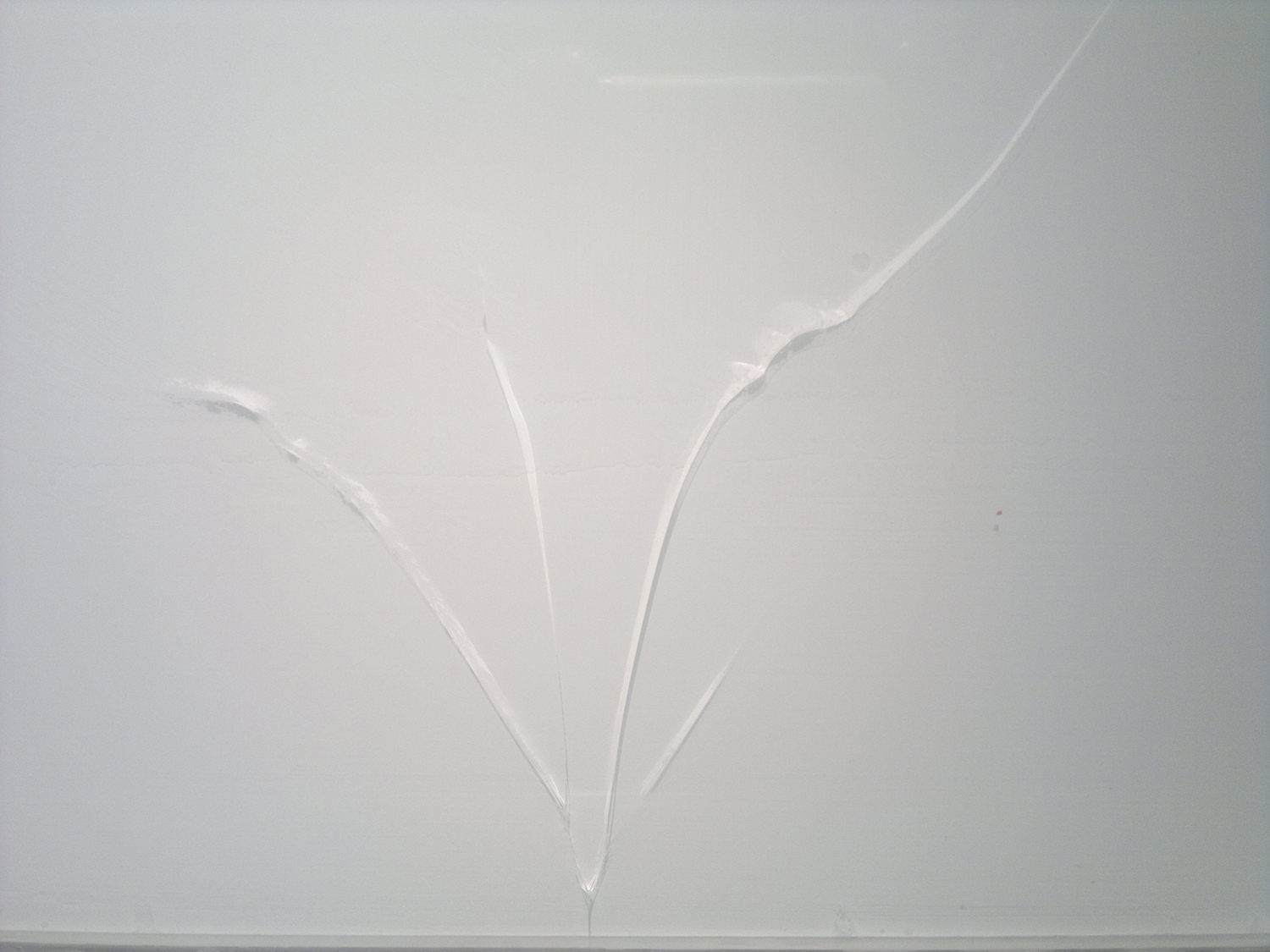 Investor požadoval skleněný obklad za sporákem, nesprávně mu však bylo instalováno chlazené sklo. V době vaření byla teplota na skle v blízkosti sporáku vysoká a ostatní části tabule byly chladné. Lokální nárůst napětí vlivem teplotní roztažnosti byl tak velký, že došlo k prasknutí skla, viz obr. 3.