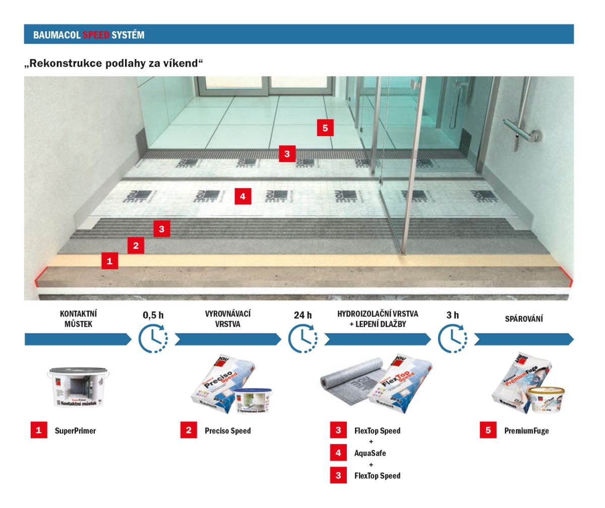 Jedna věc je teorie, avšak nejvíce zdůrazní přednosti výrobků s označením Speed příklady z praxe, např. „víkendová“ realizace obkladů a dlažby v koupelně se sprchovým koutem o běžných bytových rozměrech. Pokud začneme v sobotu ráno s přípravou podkladu, tedy aplikací kontaktního můstku Baumit SuperPrimer na stávající očištěný a soudržný povrch, můžeme již po 30 minutách nanášet, v případě nutnosti vyrovnání, vyrovnávací vrstvu tvořenou výrobkem Baumit Baumacol Preciso Speed. Následná nejdelší 24hodinová technologická pauza v celém zrychleném procesu poskytuje dostatek času na přípravu materiálů hydroizolační vrstvy, tedy flexibilní lepicí malty Baumit Baumacol FlexTop Speed, do které se „za mokra“ vtlačí hydroizolační membrána Baumit Baumacol Aquasafe. Poté je možné okamžité lepení obkladu. Po poslední nutné technologické přestávce v délce 3 hodin můžeme obklad či dlažbu finálně spárovat pomocí spárovací hmoty Baumit PremiumFuge. Po sečtení všech pracovních časů a technologických přestávek je nakonec kouzlo 48hodinové realizace koupelny splněno a nedělní večer už může být věnován zaslouženému odpočinku po práci. I proto se výrobky Baumit řady Speed těší na trhu velké oblibě.
