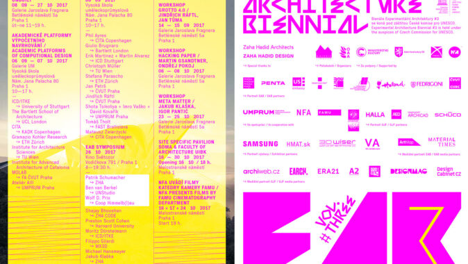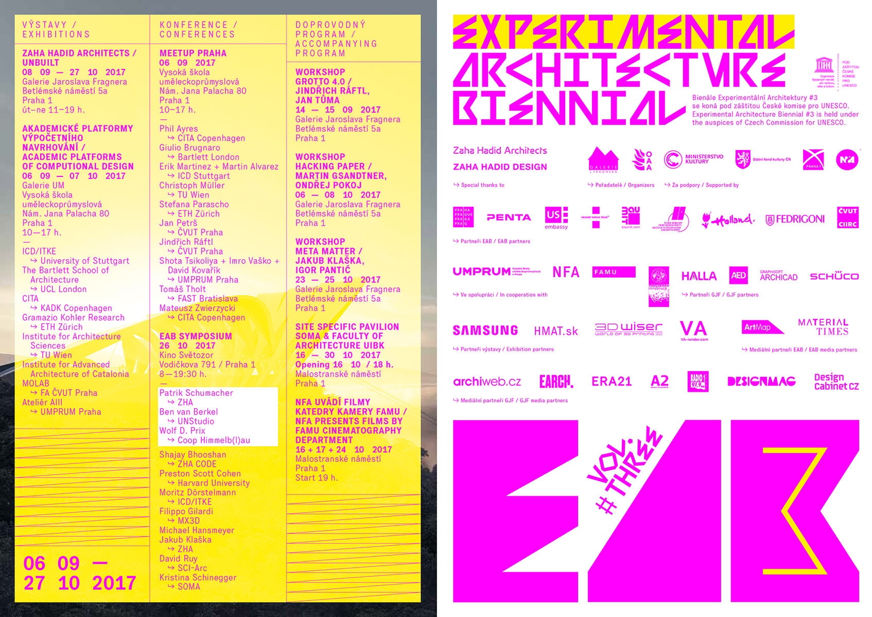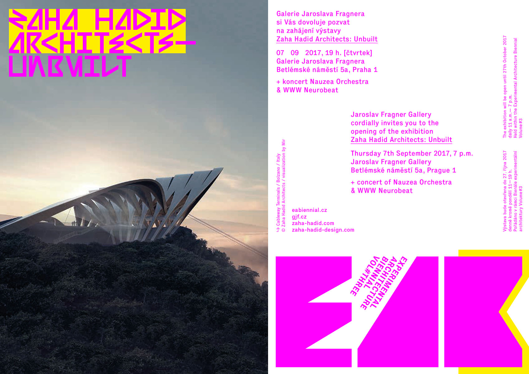 Zaha Hadid Architects: Unbuilt – výstava představující neznámé, nerealizované projekty jednoho z nejvýznamnějších architektonických ateliérů na světě. Bienále: výstavy (GJF, UMPRUM), meetup, mezinárodní sympozium, workshopy, site specific pavilon s experimentální projekcí.