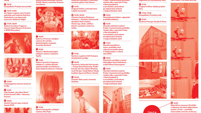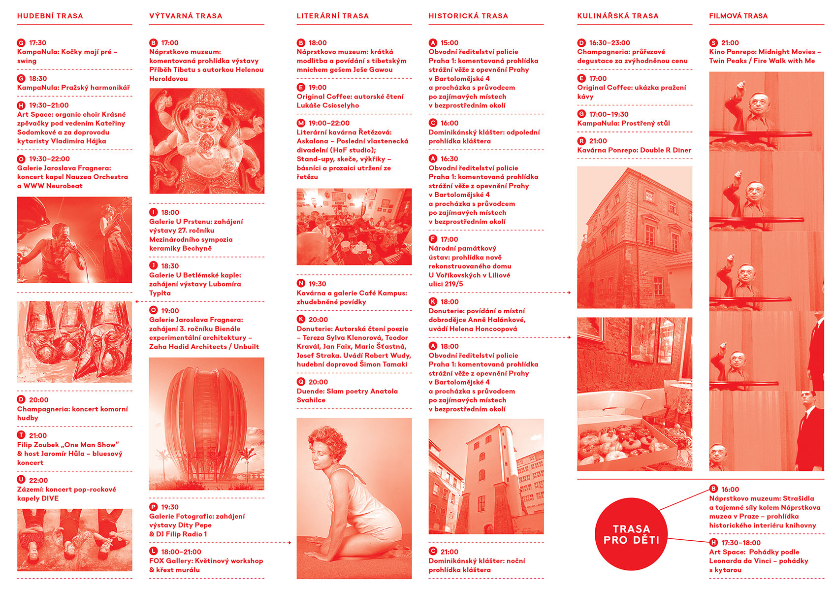 Vernisážovou trasu mohou návštěvníci započít v Jilské v Galerii U Prstenu (výstava již 27. ročníku Mezinárodního sympozia keramiky Bechyně), pokračovat na náměstí v Galerii U Betlémské kaple (obrazy Lubomíra Typlta), dále v protější Galerii Jaroslava Fragnera (Bienále experimentální architektury #3: Zaha Hadid Architects) a nakonec se vypravit až do Stříbrné, do Galerie Fotografic (fotografie Dity Pepe, spolu s DJ Filipem z Radia 1). K aktuální výstavě Příběh Tibetu v Náprstkově muzeu provede zájemce přímo autorka výstavy Helena Heroldová. Ve FOX Gallery na rohu Náprstkovy a ulice Karoliny Světlé se kromě květinového workshopu (pod vedením floristek Míši Bachoríkové a Šárky Cerhové, zvýhodněná cena 250 Kč, rezervace: info@foxgallery.cz či na tel. 737 077 200) bude také křtít  murál nazvaný Nekonečno výtvarníka Davida Mazance.
