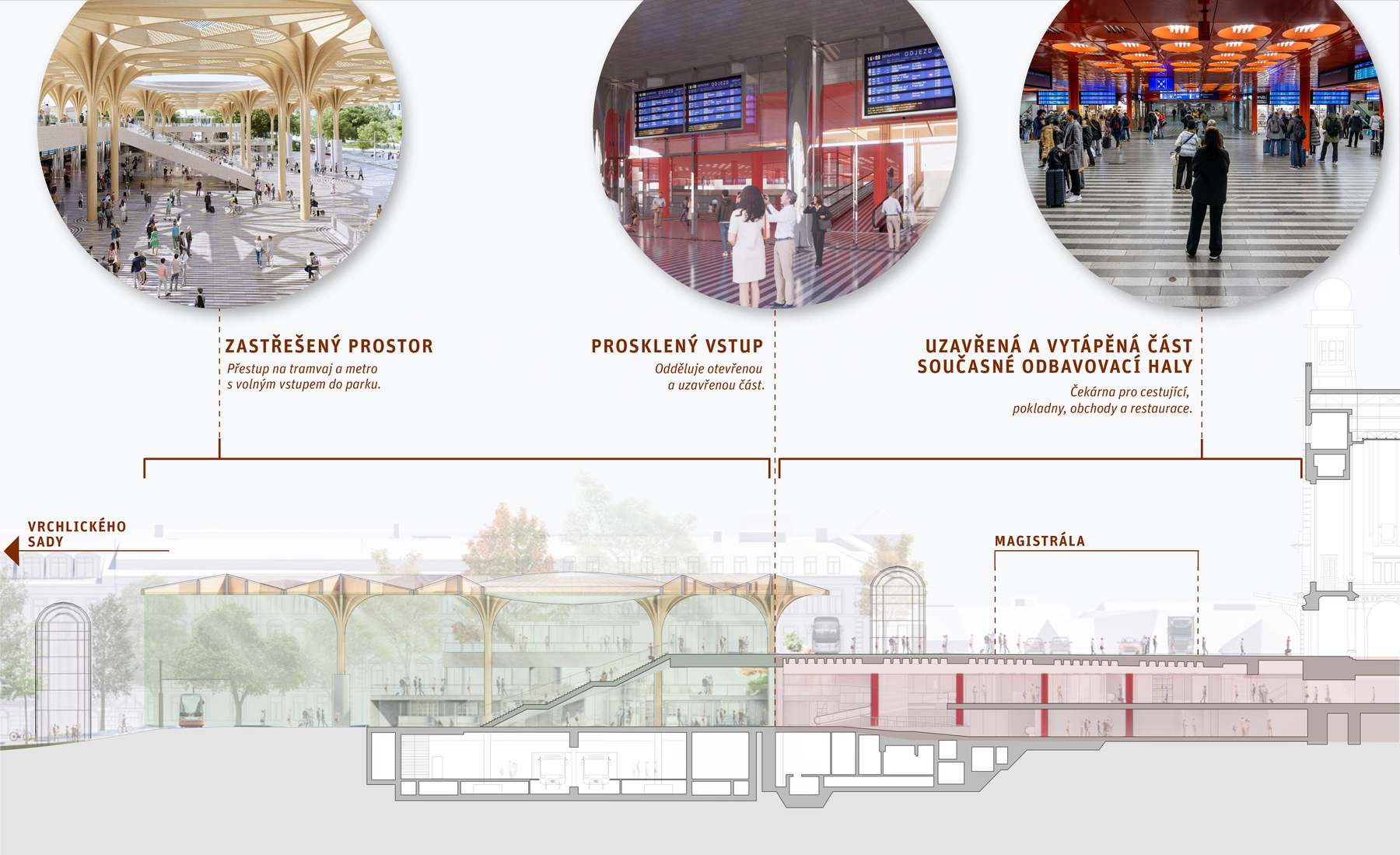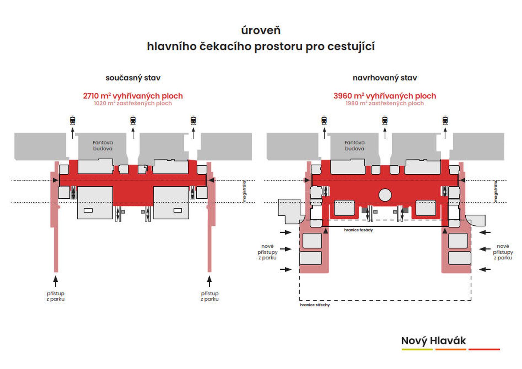 Prostor v přední části haly, který dnes není příliš využívaný, bude nově otevřený do všech stran a propojený s parkem. Díky otevření celé plochy budou cestující moci na nádraží přicházet ze všech směrů, tj. přímo z Vrchlického sadů, od ulice Bolzanova nebo z Václavského náměstí. Výsledné zpřehlednění území umožní cestujícím okamžitou orientaci i příjemný pohyb v prosvětleném a otevřeném prostoru. Kompletní zastřešení zase poskytne mnohem větší komfort, protože cestující mohou přejít z tramvajové zastávky přímo před halou až do metra, vlaku, autobusu i na taxi bez bloudění a suchou nohou. Přitom se jim otevírá výhled na impozantní historickou Fantovu budovu. Samozřejmostí je bezbariérovost celého prostoru. Boční vstupy z parku budou například ve stejné úrovni jako přístupy k vlakům.