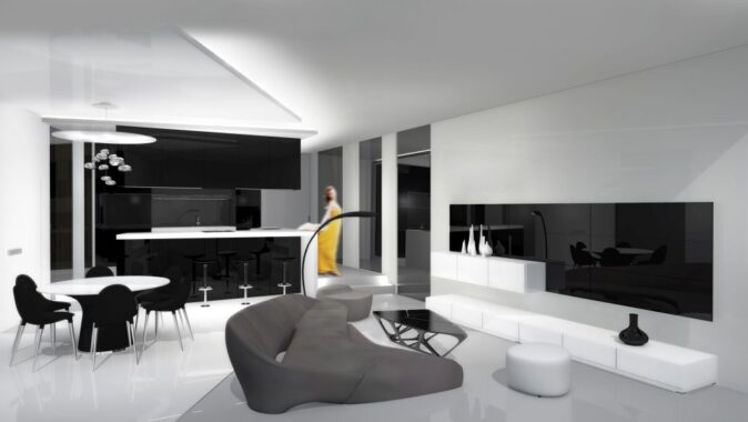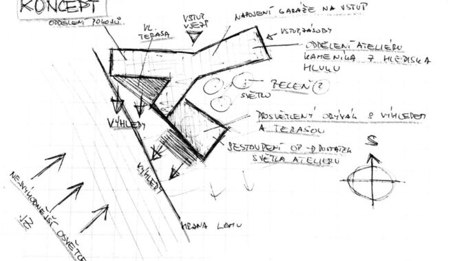 Součástí rodinného domu pro čtyři obyvatele je ateliér kameníka, který je samostatně přístupný z východní strany. Má krytý prostor v rámci hmoty domu, takže umožňuje práci ve venkovním prostředí. Dynamická hmota stavby definuje vnitřní prostory – hlavní obytné místnosti navazují na dřevěné terasy, je v nich dostatek přirozeného světla a nejkrásnější výhledy na jezero. Dispozice je navržena tak, aby bylo možné v případě menší rekonstrukce oddělení západního křídla. Tato část je řešena bezbariérově.