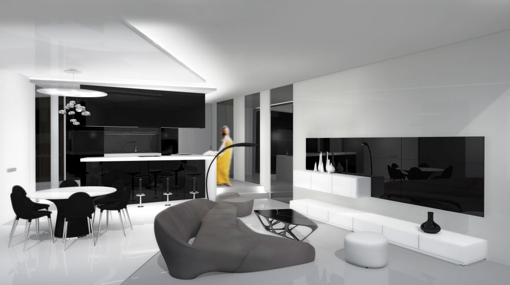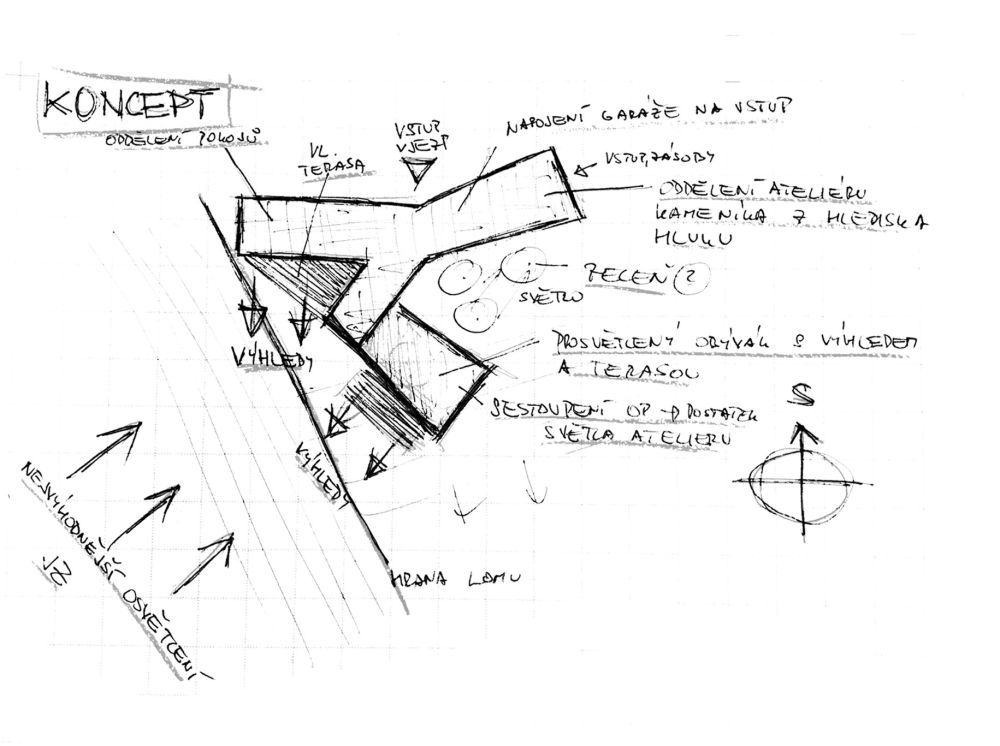 Součástí rodinného domu pro čtyři obyvatele je ateliér kameníka, který je samostatně přístupný z východní strany. Má krytý prostor v rámci hmoty domu, takže umožňuje práci ve venkovním prostředí. Dynamická hmota stavby definuje vnitřní prostory – hlavní obytné místnosti navazují na dřevěné terasy, je v nich dostatek přirozeného světla a nejkrásnější výhledy na jezero. Dispozice je navržena tak, aby bylo možné v případě menší rekonstrukce oddělení západního křídla. Tato část je řešena bezbariérově.