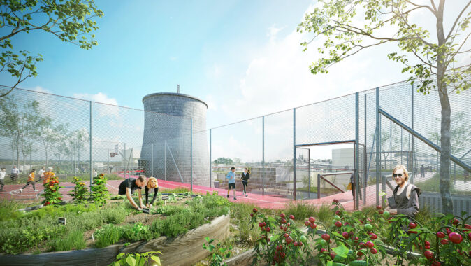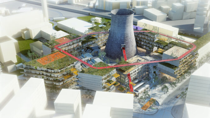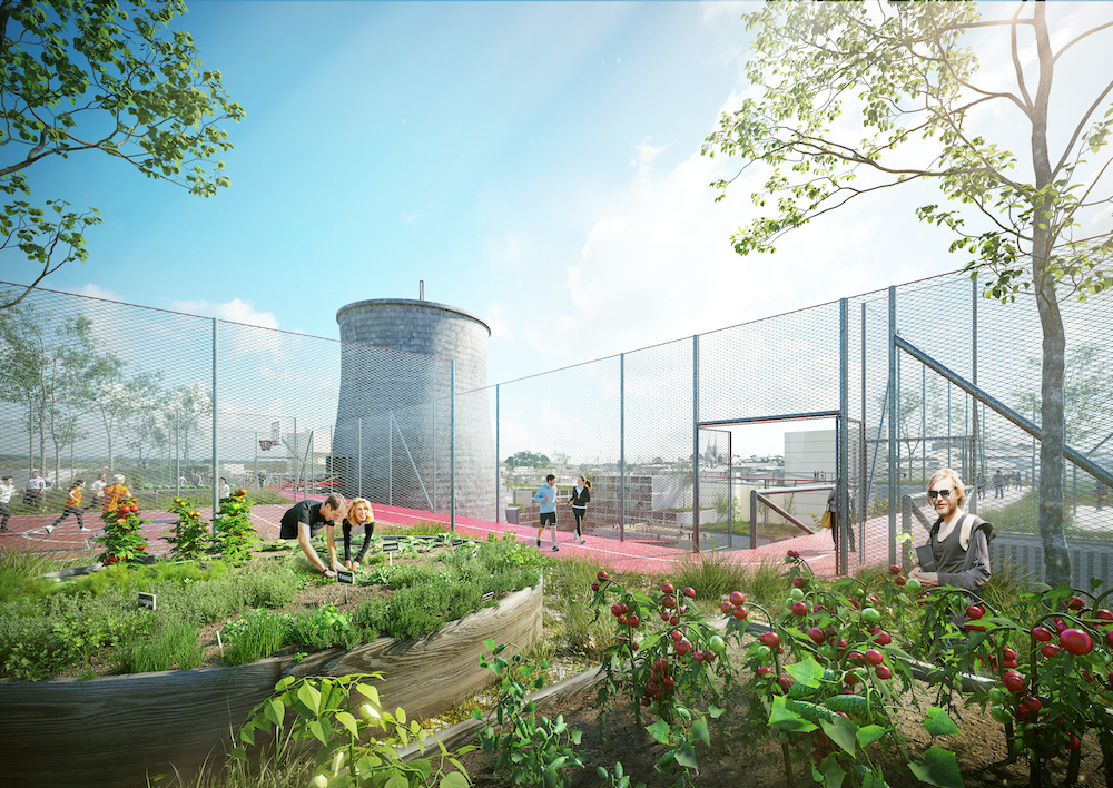 Nevyužívaná střešní krajina v nehostinné industriální čtvrti se změní na nevšední veřejný prostor. Nové střešní terasy nabídnou sportoviště, zeleň i zahrádky pro komunitní pěstování. Architekti navrhli také 400 metrů dlouhý SKYWALK, který prochází chladící věží a spojí všechny budovy. Stane se unikátní atrakcí a městskou vyhlídkou funkčně připomínající třeba horské Stezky v oblacích nebo dřevěnou konstrukci Metropol Parasol v Seville. Vedle EVENT HUBU, CITY HUBU a CULTURE HUBU doplní zástavbu šest nových budov pro bydlení a pracovní zázemí. Celkově se jedná o 30 tisíc metrů čtverečních ploch.