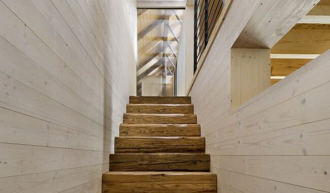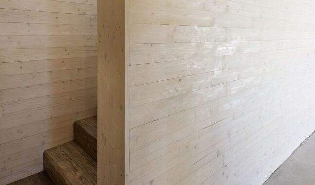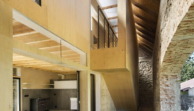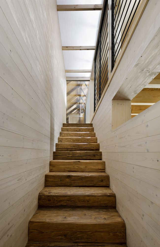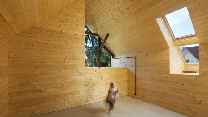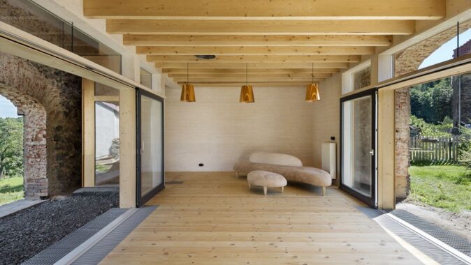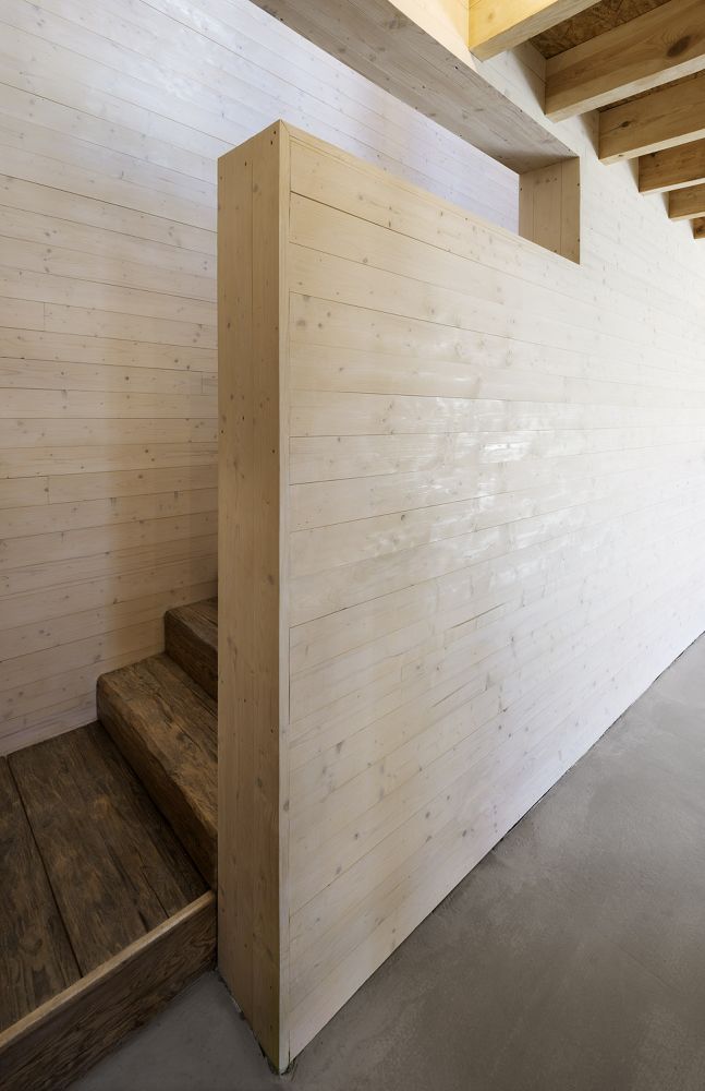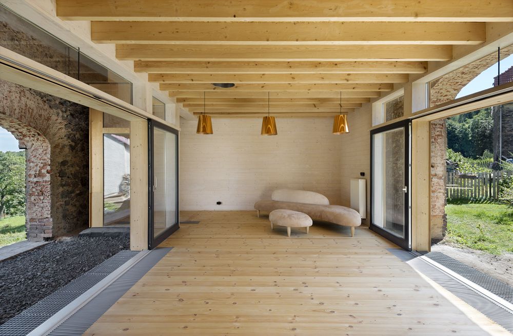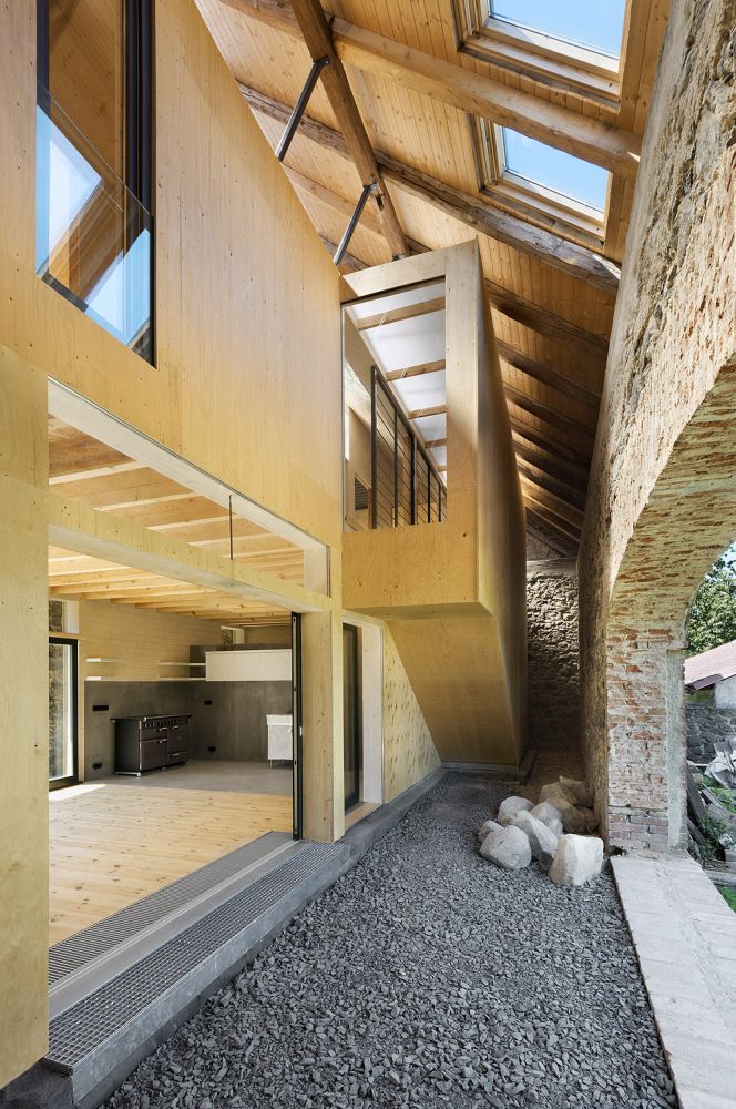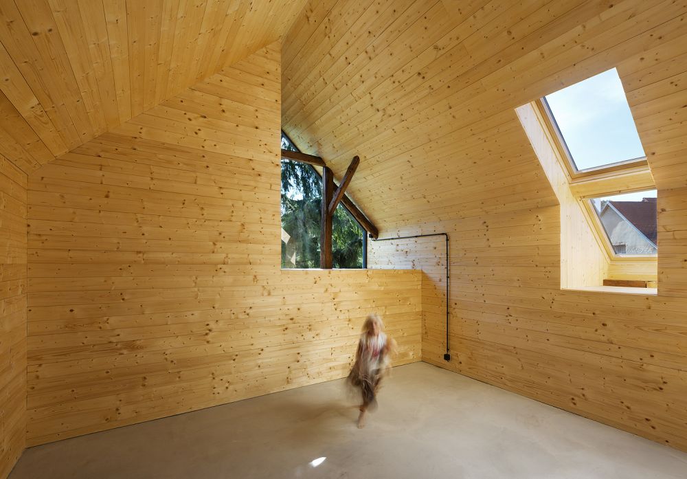 Šedesát centimetrů silné zdivo stodoly z kamene a cihel s pouze mělkými základy a zároveň požadavek na zachování původního vzhledu stodoly společně s nutností splnit nároky na tepelnou izolaci (vnější izolace by zcela pozměnila charakter objektu, vnitřní izolace by byla i vzhledem k vzlínání vlhkosti problematická) vedly ke konceptu domu v domě. Kamenná stavba stodoly chrání vnitřní dřevostavbu před deštěm, vnitřní dřevěný dům působí jako větrná a tepelná ochrana. Mezi starým a novým objektem je vytvořen nevytápěný vnitřní meziprostor, který je využíván zejména v létě. Tento meziprostor, který, až na jižní fasádu, obklopuje celý dům, funguje jako druhý plášť. Má pozitivní vliv na energetickou bilanci domu v zimě a zároveň působí jako tepelná ochrana v letních měsících. Dřevěný dům opakuje tvar stodoly uvnitř. Schodiště z této formy vyčnívá jako zvláštní prostorový objem. Nová dřevěná konstrukce převzala během stavby nosnou funkci starého krovu. Původní odstraněné trámy byly integrovány do projektu jako stupně pro schodiště. Velkorysé bezrámové prosklené otvory dřevostavby propojují vnitřek, vnějšek a meziprostor. Ten je v letních měsících využíván jak další obytný prostor. Dva průjezdové otvory stodoly na jih a na sever nabízejí poutavé prolnutí s okolní přírodou. Vznikl tak dům plný výhledů a průhledů.